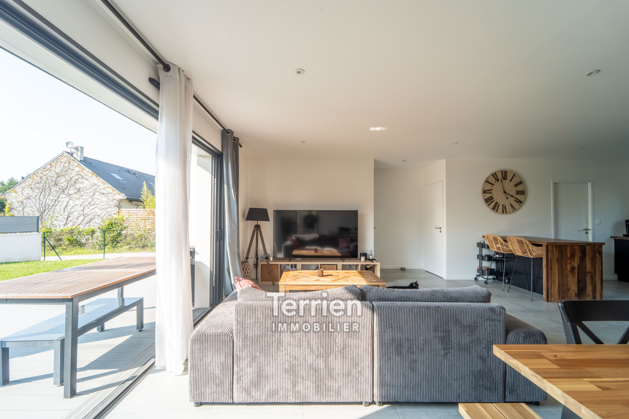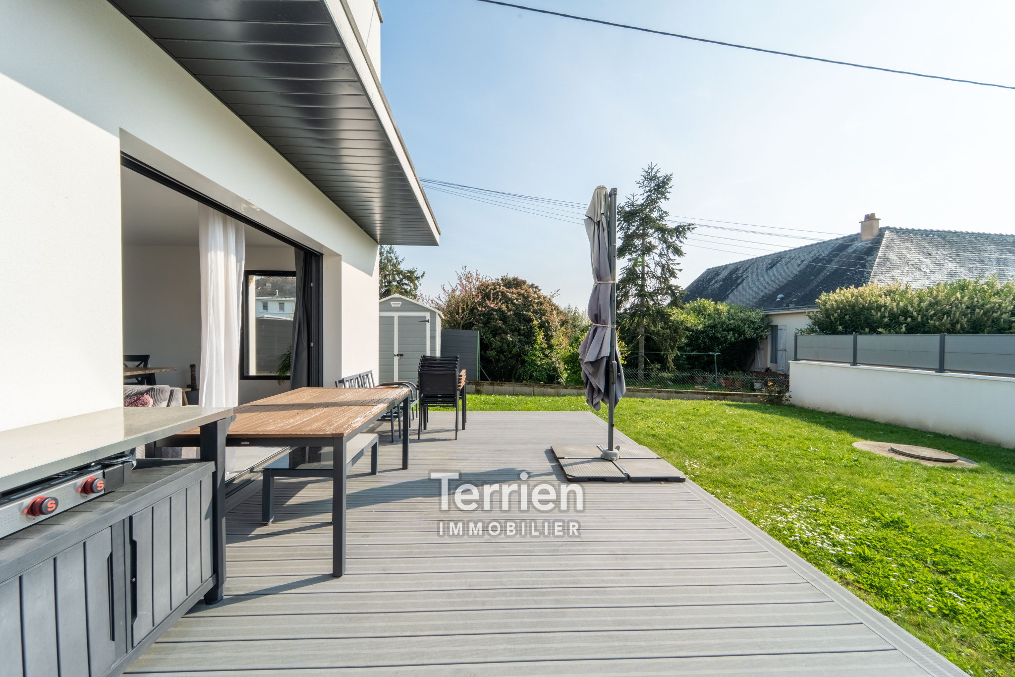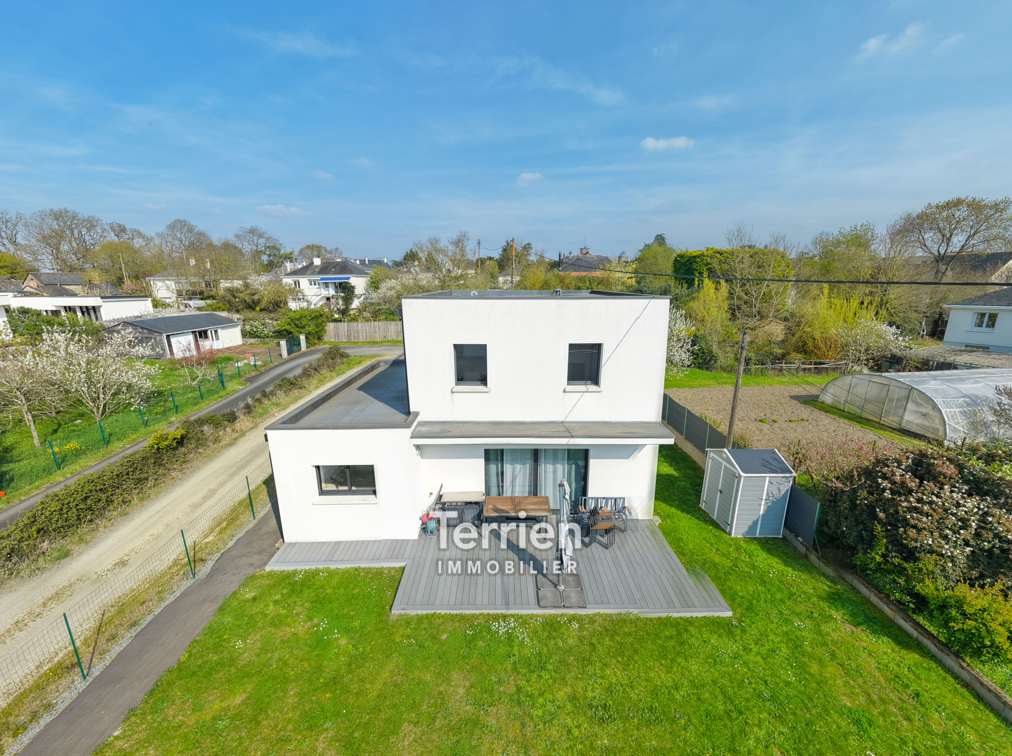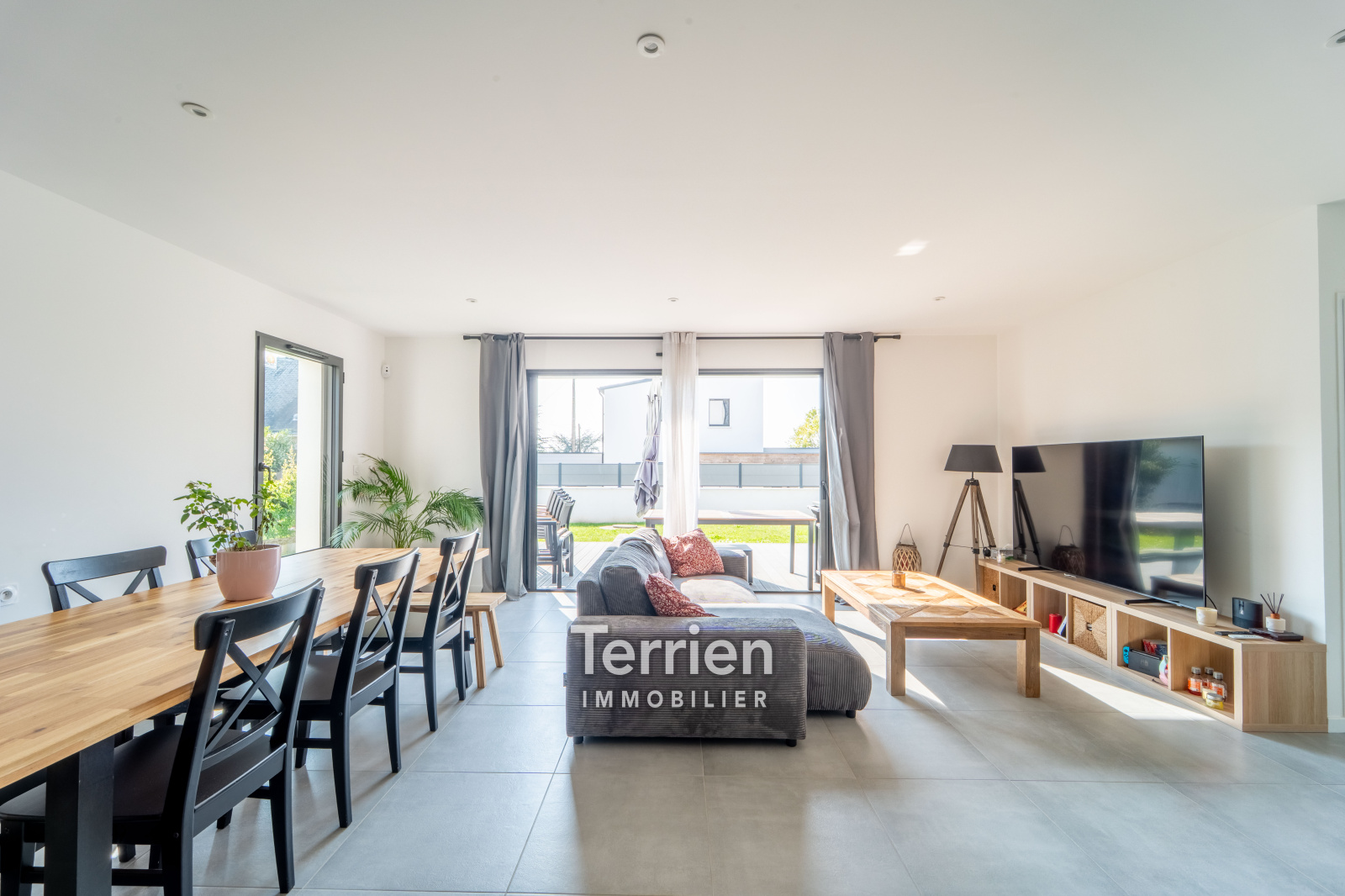 EN VENTE Chez TERRIEN IMMOBILIER. Maison contemporaine située sur la commune de Murs-Érigné, à 8 minutes du centre d'Angers et de la gare, cette maison d'une surface habitable de 117 m² construite en 2021 bénéficie d'un emplacement idéal à proximité des écoles et espaces verts. Sur un terrain clos de 480 m², le jardin bien entretenu ajoute au charme du lieu. À l'avant, un espace aménagé avec un carport vous permet de stationner plusieurs véhicules aisément. L'entrée s'ouvre sur un double séjour spacieux de près de 50 m², offrant un accès de plain-pied à une terrasse exposée plein sud. La cuisine est moderne et ouverte sur le salon. Toujours au rez-de-chaussée, vous trouverez une vaste chambre avec dressing, une salle d'eau avec doubles vasques et des toilettes séparées. À l'étage, trois chambres d'environ 11 m² chacune vous attendent, accompagnées d'une salle de bain et de toilettes séparées. La luminosité inonde la maison grâce aux grandes ouvertures orientées sud-ouest, captant le soleil toute la journée. Les fenêtres en aluminium sont équipées de volets roulants électriques, et la grande baie vitrée à galandage du salon offre une vue imprenable sur le jardin. Le chauffage au sol est présent aussi bien au rez-de-chaussée qu'à l'étage, associé à une pompe à chaleur pour une solution économique. Cette maison exceptionnelle ne nécessite aucun travaux.