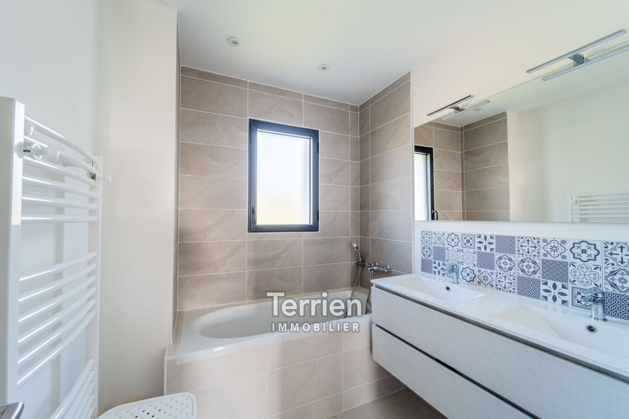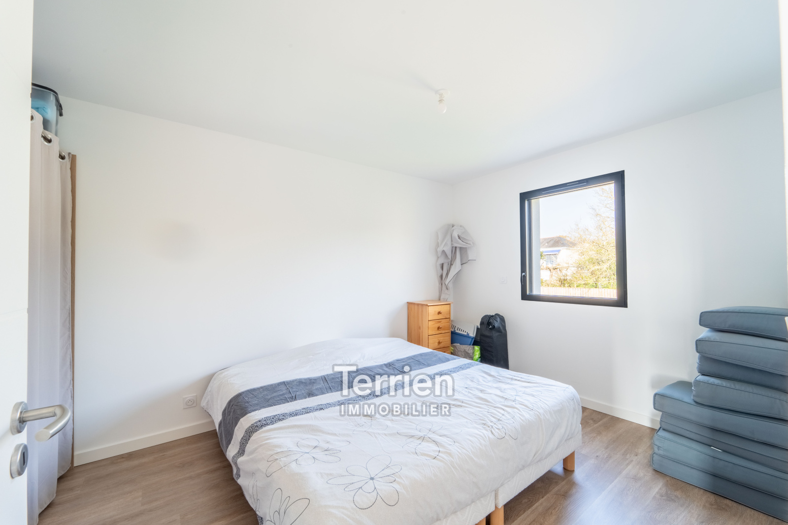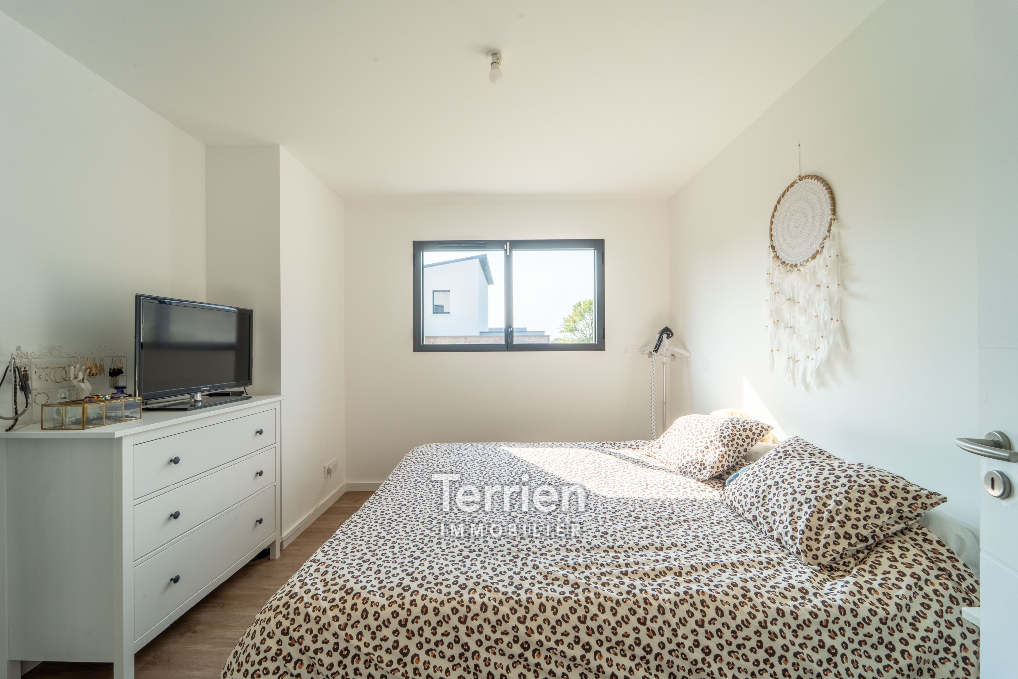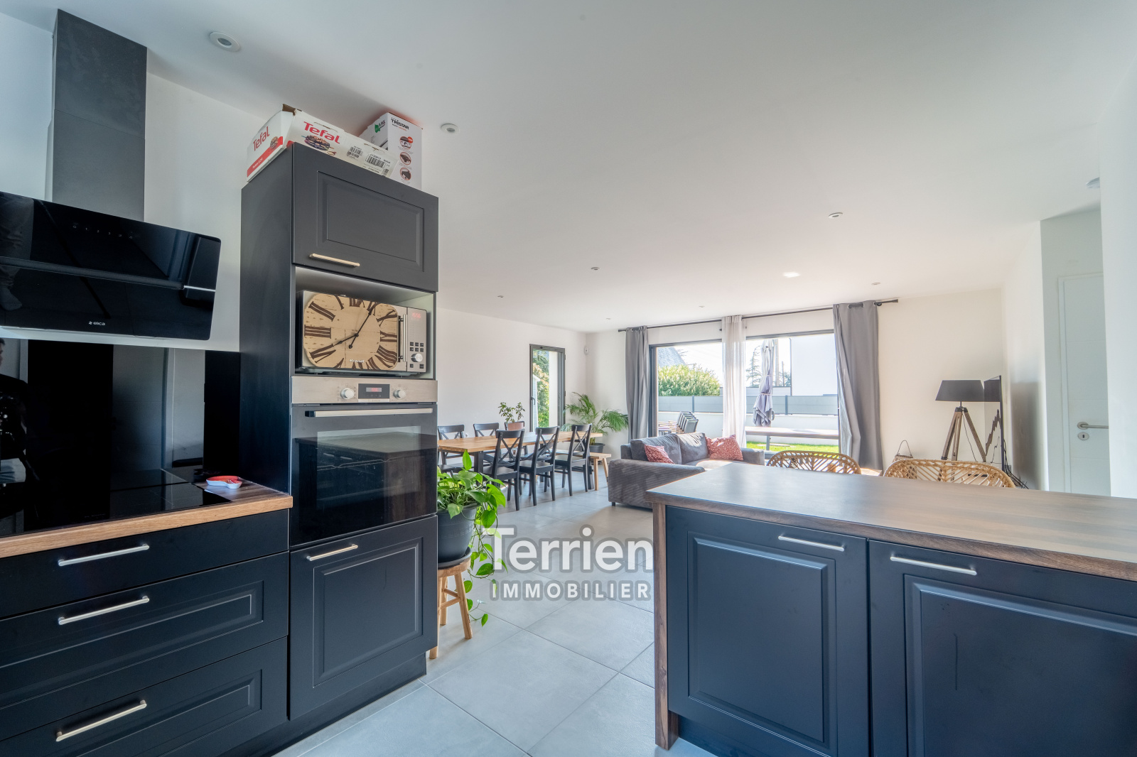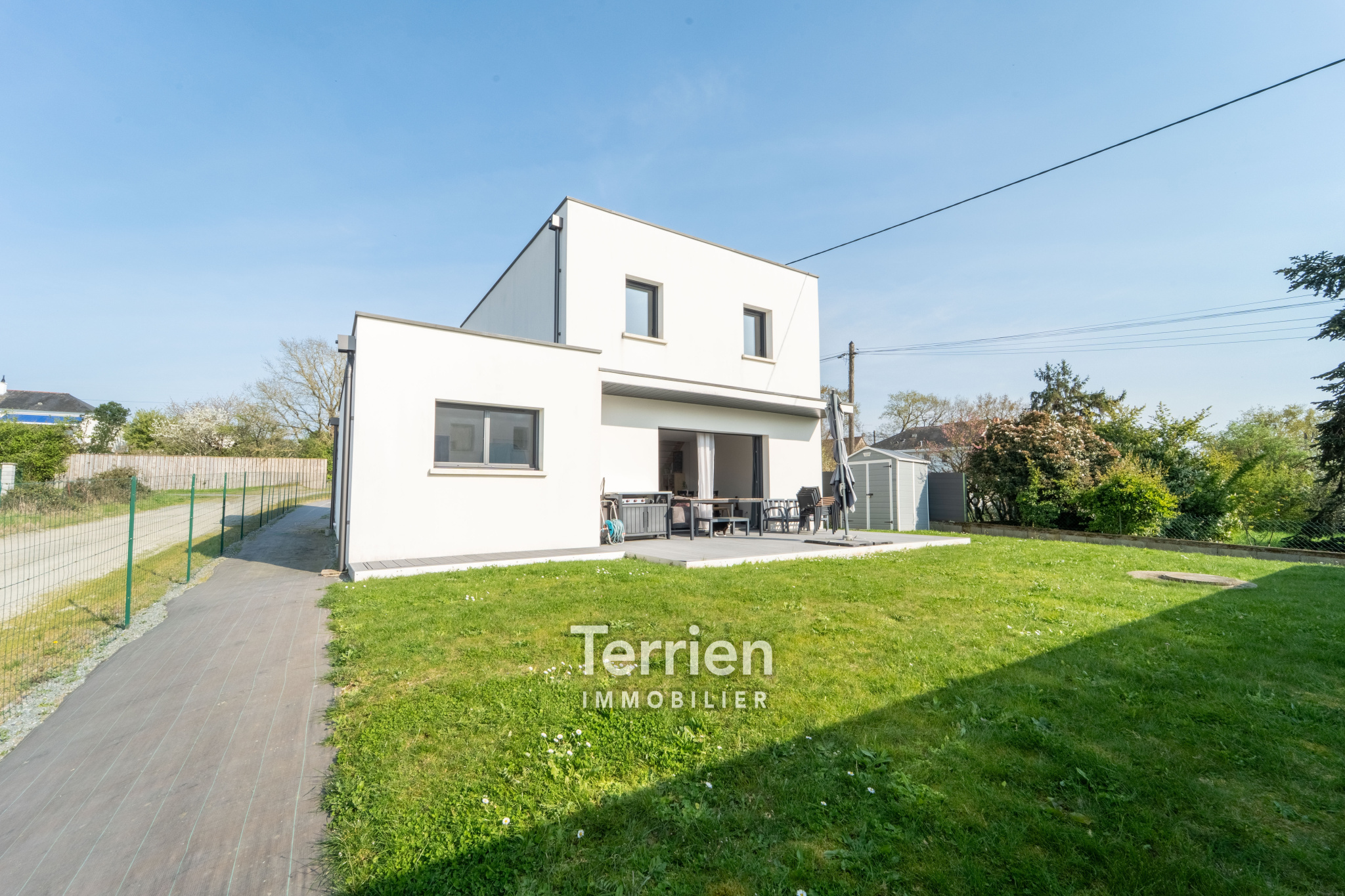 EN VENTE Chez TERRIEN IMMOBILIER. Maison contemporaine située sur la commune de Murs-Érigné, à 8 minutes du centre d'Angers et de la gare, cette maison d'une surface habitable de 117 m² construite en 2021 bénéficie d'un emplacement idéal à proximité des écoles et espaces verts. Sur un terrain clos de 480 m², le jardin bien entretenu ajoute au charme du lieu. À l'avant, un espace aménagé avec un carport vous permet de stationner plusieurs véhicules aisément. L'entrée s'ouvre sur un double séjour spacieux de près de 50 m², offrant un accès de plain-pied à une terrasse exposée plein sud. La cuisine est moderne et ouverte sur le salon. Toujours au rez-de-chaussée, vous trouverez une vaste chambre avec dressing, une salle d'eau avec doubles vasques et des toilettes séparées. À l'étage, trois chambres d'environ 11 m² chacune vous attendent, accompagnées d'une salle de bain et de toilettes séparées. La luminosité inonde la maison grâce aux grandes ouvertures orientées sud-ouest, captant le soleil toute la journée. Les fenêtres en aluminium sont équipées de volets roulants électriques, et la grande baie vitrée à galandage du salon offre une vue imprenable sur le jardin. Le chauffage au sol est présent aussi bien au rez-de-chaussée qu'à l'étage, associé à une pompe à chaleur pour une solution économique. Cette maison exceptionnelle ne nécessite aucun travaux.