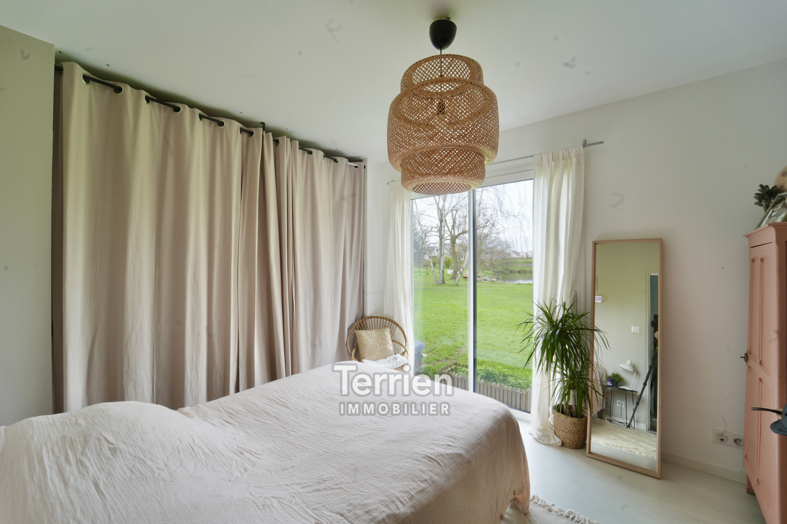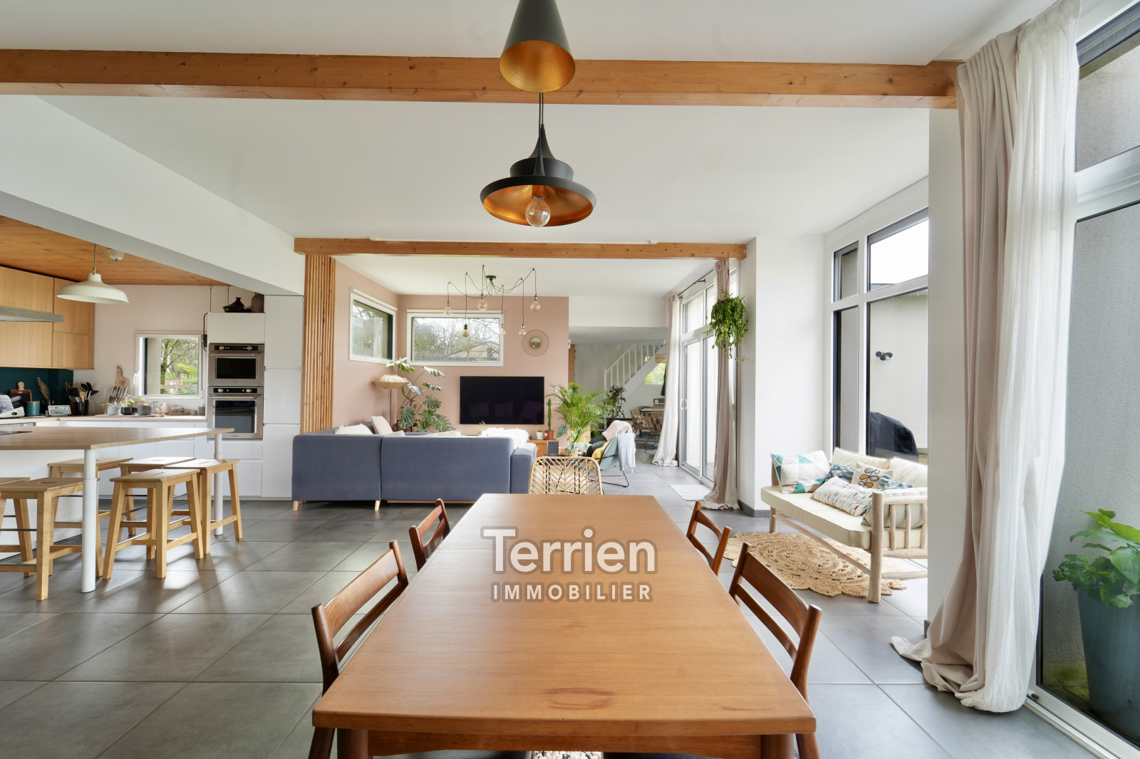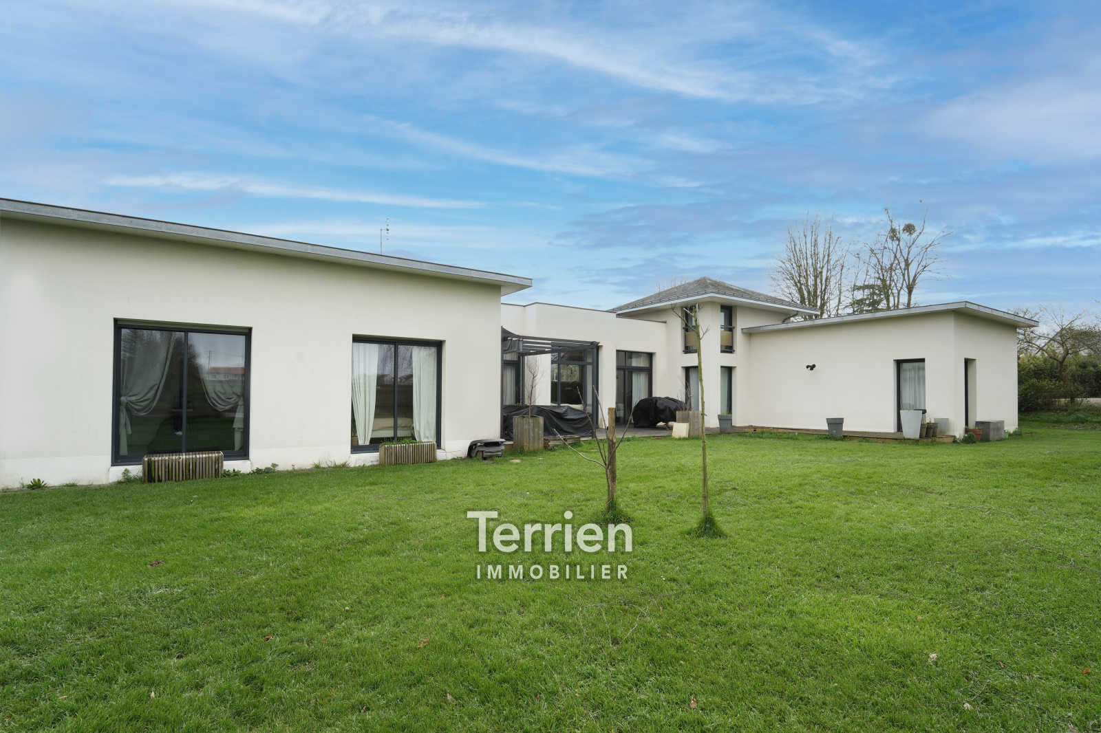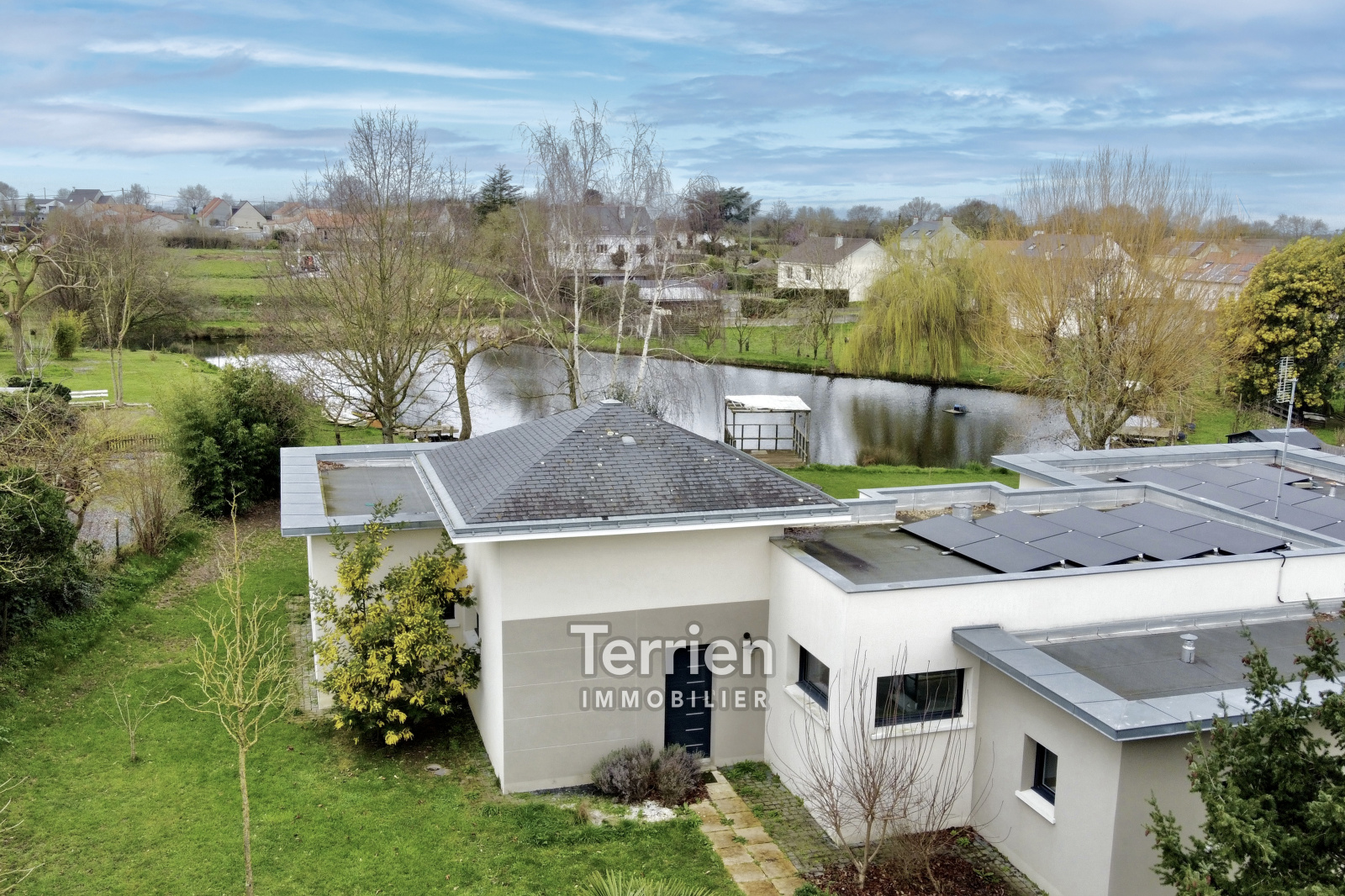 Une maison d'architecte située dans un quartier très agréable et à proximité du centre bourg de La Pommeraye. Une belle maison d’architecte d’une surface habitable de 171m2 sur une parcelle de 1850m2. Cette maison de plain-pied au style épuré propose une entrée (patio) desservant le salon/salle à manger avec très belle hauteur sous plafond (3m) et une cuisine récente ouverte avec beaucoup de rangements. Cet espace de vie de 55m2 est orienté plein ouest avec une très belle vue sur les extérieurs et l’étang. Coté entrée, on retrouve une belle suite parentale comprenant un espace de rangements, une salle d’eau et des wc. À l’étage de la Tour, une pièce avec charpente apparente permettant d’aménager un bureau ou une 5ème chambre. Côté nuit pour les enfants, on retrouve un espace salon/salle de jeux, 3 chambres de belles surfaces, une salle de bains et un wc. les extérieurs sont bien entretenus et arborés, une grande terrasse côté ouest permet de profiter . de la vue sur l’étang. Sur le côté de la maison, un carport de 35m2 a été aménagé pour stationner deux véhicules. Cette maison est chauffée via une aérothermie, chauffage au sol et l’ensemble des huisseries sont en double vitrage aluminium KLINE. En énergie la maison bénéficie d'une installation de panneaux solaires qui permet de grosses économies énergétiques et une revente d'électricité. DPE B - TERRIEN IMMOBILIER