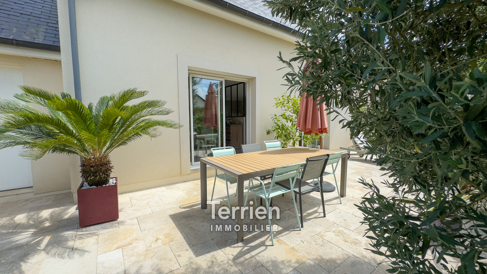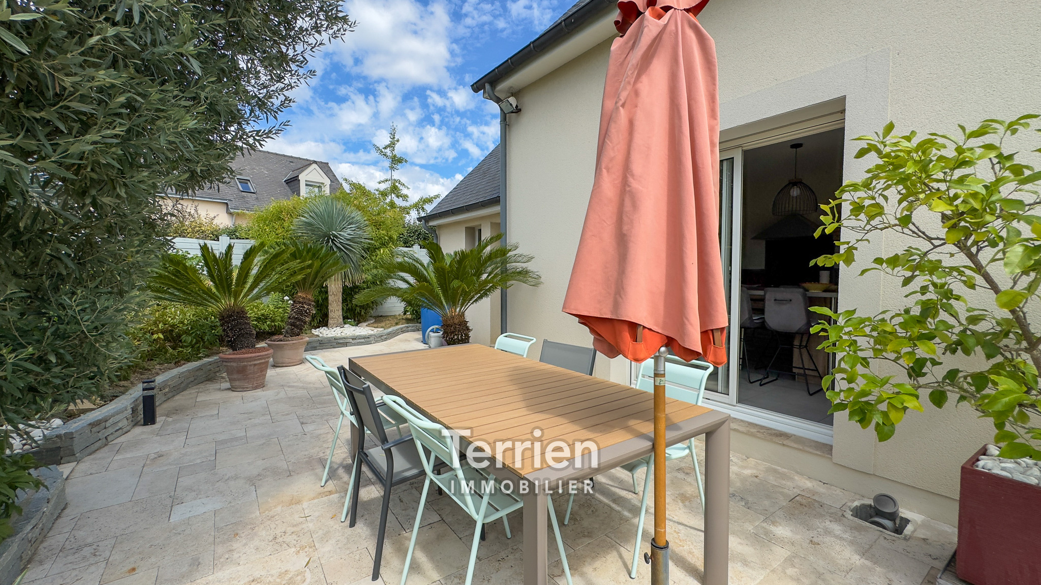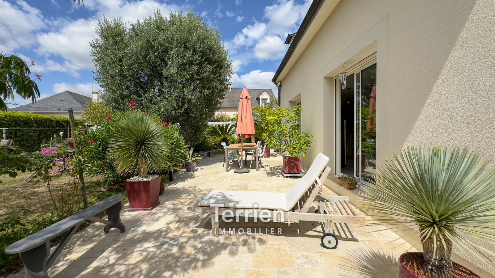 EN VENTE Chez TERRIEN IMMOBILIER. A 20minutes d’Angers, dans la charmante commune de Saint-Germain-des-Près, cette maison de caractère est idéalement située près des commerces locaux et des transports scolaires. Son style unique et l'entretien soigné de son extérieur sauront vous charmer. S'étendant sur 112 m² habitables, cette maison édifiée sur un terrain de 638 m² entièrement clos. Le tour de la maison est agrémenté d'un revêtement en travertin et d'une terrasse bien exposée offrant une vue apaisante sur l'olivier et le jardin. L'extérieur est incontestablement un point fort, avec des chiens assis sur la façade, un crépi et une toiture en excellent état. À l'intérieur, la maison se révèle accueillante dès l'entrée, grâce à un espace de vie agréable et chaleureux grâce au poêle Gaudin qui assure un chauffage efficace et économique pour l'ensemble de l'habitation. Les baies en aluminium à double vitrage et les volets électriques apportent confort et luminosité à cette pièce de vie, qui comprend une salle à manger et un séjour orientés vers la terrasse. La cuisine neuve et harmonieuse, est dotée de nombreux rangements et d'un îlot central. Elle communique avec le garage carrelé qui offre également un espace arrière-cuisine. La partie nuit au rez-de-chaussée comprend une chambre avec dressing et un WC sous l'escalier. À l'étage, le palier ou mezzanine dessert deux chambres, une salle de bains spacieuse et lumineuse équipée d'une baignoire et d'une double vasque. Le palier pourraît être transformé en un espace nuit pour créer une chambre supplémentaire grâce à une cloison, comme le grenier se trouvant accessible par ce pallier. En résumé, cette maison est en excellent état tant à l'intérieur qu'à l'extérieur, sans travaux à prévoir. Elle dispose d'un système de chauffage à la fois économique et confortable, et la cuisine récente ajoute une touche de charme à l’ensemble. Honoraires à charge acquéreurs TERRIEN IMMOBILIER