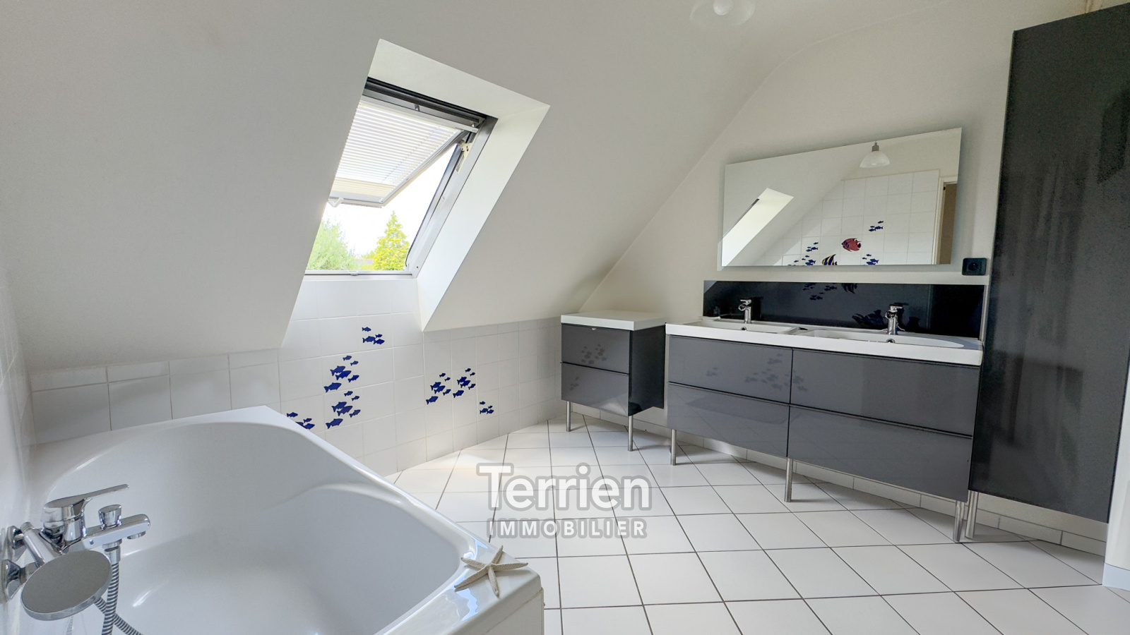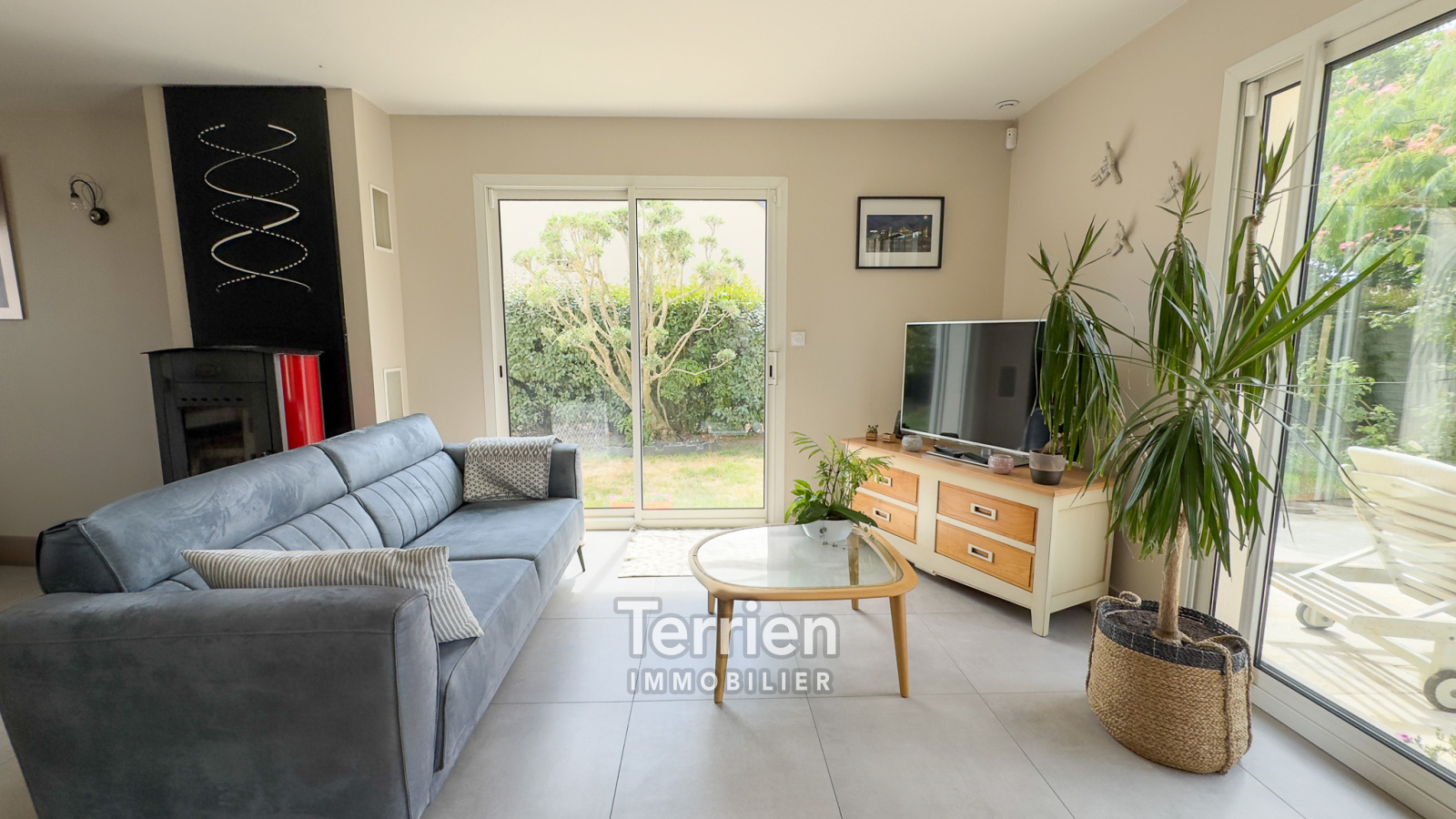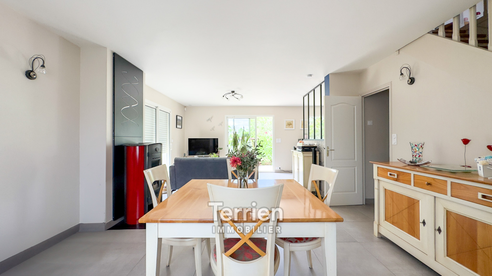 EN VENTE Chez TERRIEN IMMOBILIER. A 20minutes d’Angers, dans la charmante commune de Saint-Germain-des-Près, cette maison de caractère est idéalement située près des commerces locaux et des transports scolaires. Son style unique et l'entretien soigné de son extérieur sauront vous charmer. S'étendant sur 112 m² habitables, cette maison édifiée sur un terrain de 638 m² entièrement clos. Le tour de la maison est agrémenté d'un revêtement en travertin et d'une terrasse bien exposée offrant une vue apaisante sur l'olivier et le jardin. L'extérieur est incontestablement un point fort, avec des chiens assis sur la façade, un crépi et une toiture en excellent état. À l'intérieur, la maison se révèle accueillante dès l'entrée, grâce à un espace de vie agréable et chaleureux grâce au poêle Gaudin qui assure un chauffage efficace et économique pour l'ensemble de l'habitation. Les baies en aluminium à double vitrage et les volets électriques apportent confort et luminosité à cette pièce de vie, qui comprend une salle à manger et un séjour orientés vers la terrasse. La cuisine neuve et harmonieuse, est dotée de nombreux rangements et d'un îlot central. Elle communique avec le garage carrelé qui offre également un espace arrière-cuisine. La partie nuit au rez-de-chaussée comprend une chambre avec dressing et un WC sous l'escalier. À l'étage, le palier ou mezzanine dessert deux chambres, une salle de bains spacieuse et lumineuse équipée d'une baignoire et d'une double vasque. Le palier pourraît être transformé en un espace nuit pour créer une chambre supplémentaire grâce à une cloison, comme le grenier se trouvant accessible par ce pallier. En résumé, cette maison est en excellent état tant à l'intérieur qu'à l'extérieur, sans travaux à prévoir. Elle dispose d'un système de chauffage à la fois économique et confortable, et la cuisine récente ajoute une touche de charme à l’ensemble. Honoraires à charge acquéreurs TERRIEN IMMOBILIER