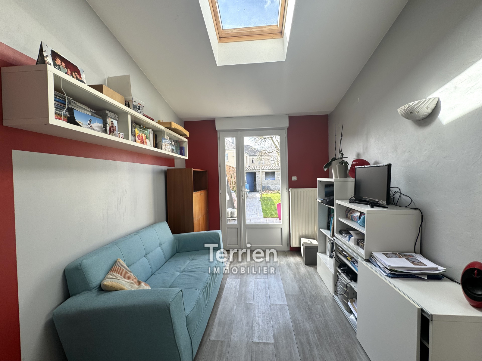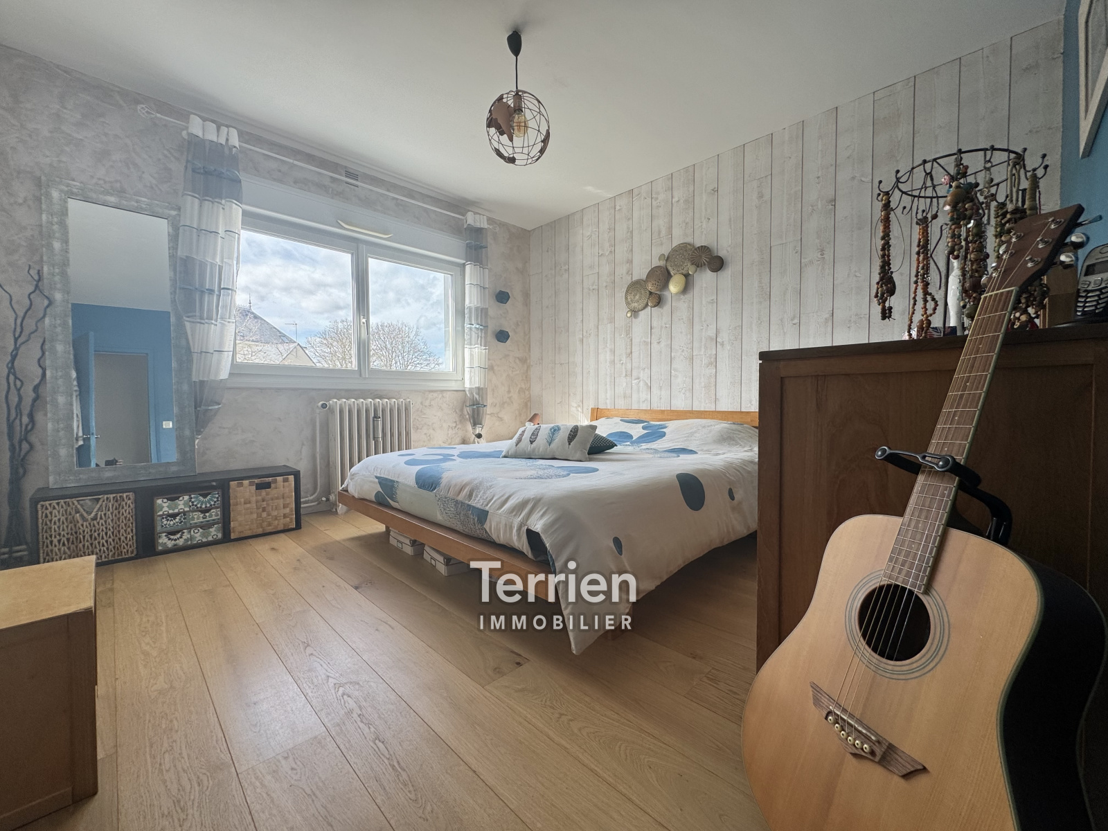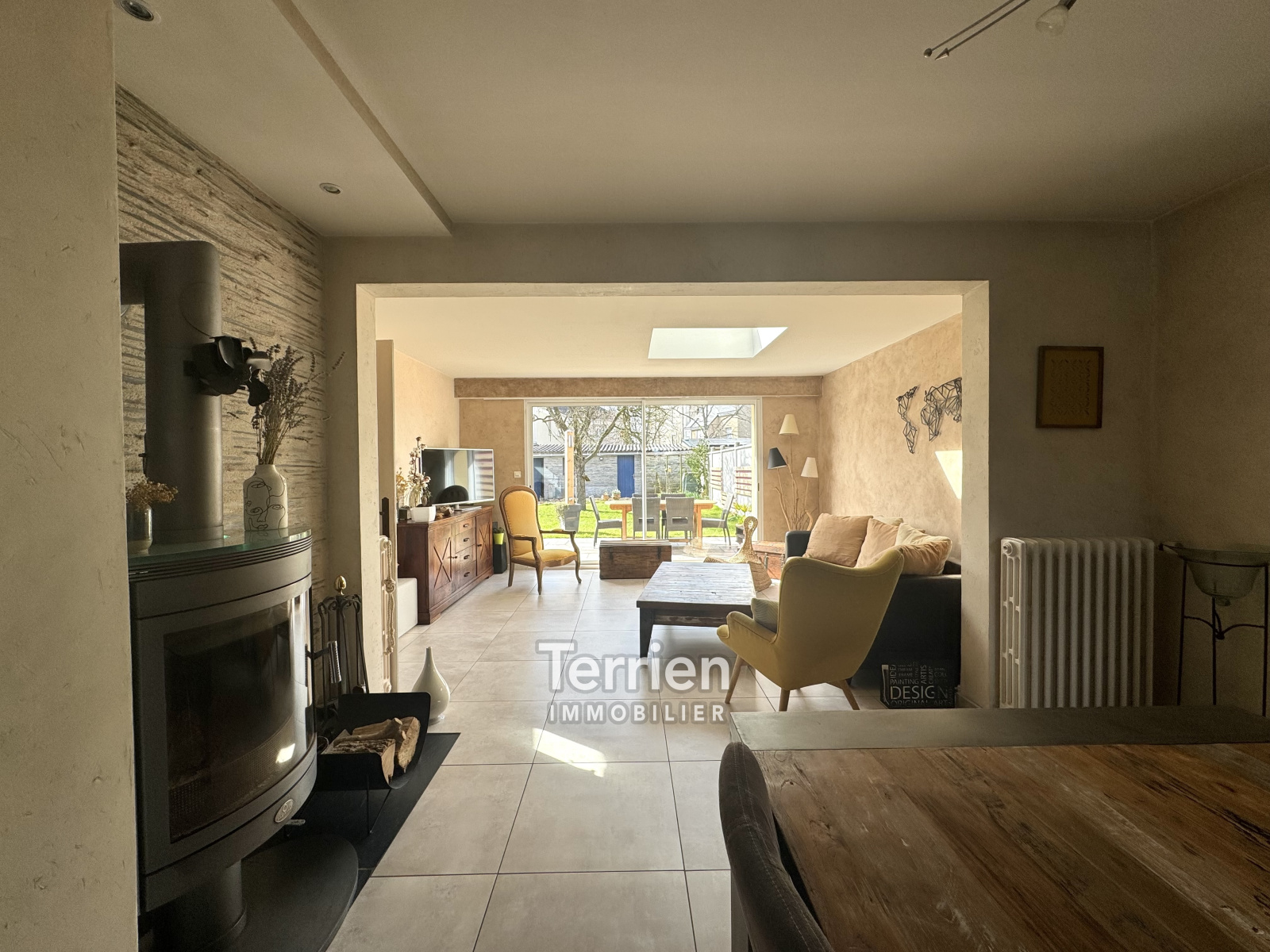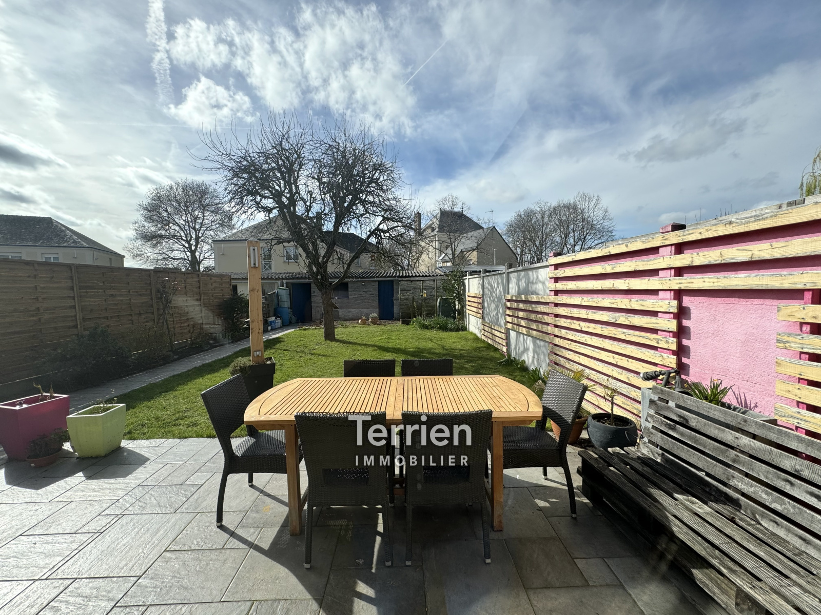 Située à proximité directe des transports et du centre-ville de Trélazé à seulement 15min d'Angers. Sur une parcelle de 282m2, cette maison en parfait état de 113m2 sur deux niveaux avec garage, dispose de belles proportions et d'un cadre très agréable à quelques pas du bourg de Trélazé. A l'avant, on retrouve une place de stationnement devant le garage et un espace paysagé à côté. On découvre une maison saine et bien entretenue, disposant au rez-de-chaussée d'une entrée avec WC, un bureau/chambre, une pièce de vie de 43m2 comprenant une cuisine dinatoire toute équipée, un coin salle à manger et un salon avec son puit de lumière dans l'extension. Cette pièce traversante avec vue sur le jardin est très agréable grâce à sa luminosité et son poêle à bois qui améliore le confort. A l'étage, on retrouve 4 chambres de tailles moyennes, une salle d'eau récente et un WC. Côté extérieur, une terrasse carrellée et un très appréciable jardin d'environ 200m2, une dépendance joliement décorée avec des ardoises du secteur. Cette maison est bien isolée et ne nécessite aucuns travaux. Elle dispose d'ouvertures en double vitrage et d'un système de chauffage au gaz de ville et d'un poêle à bois. DPE D - Honoraires à charge vendeur - TERRIEN IMMOBILIER.