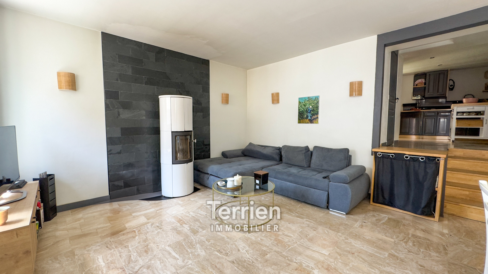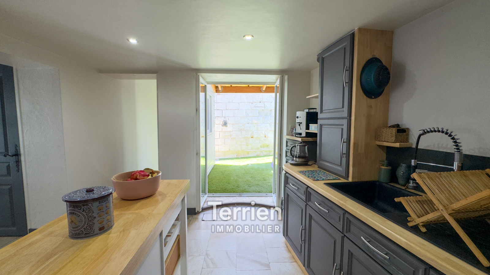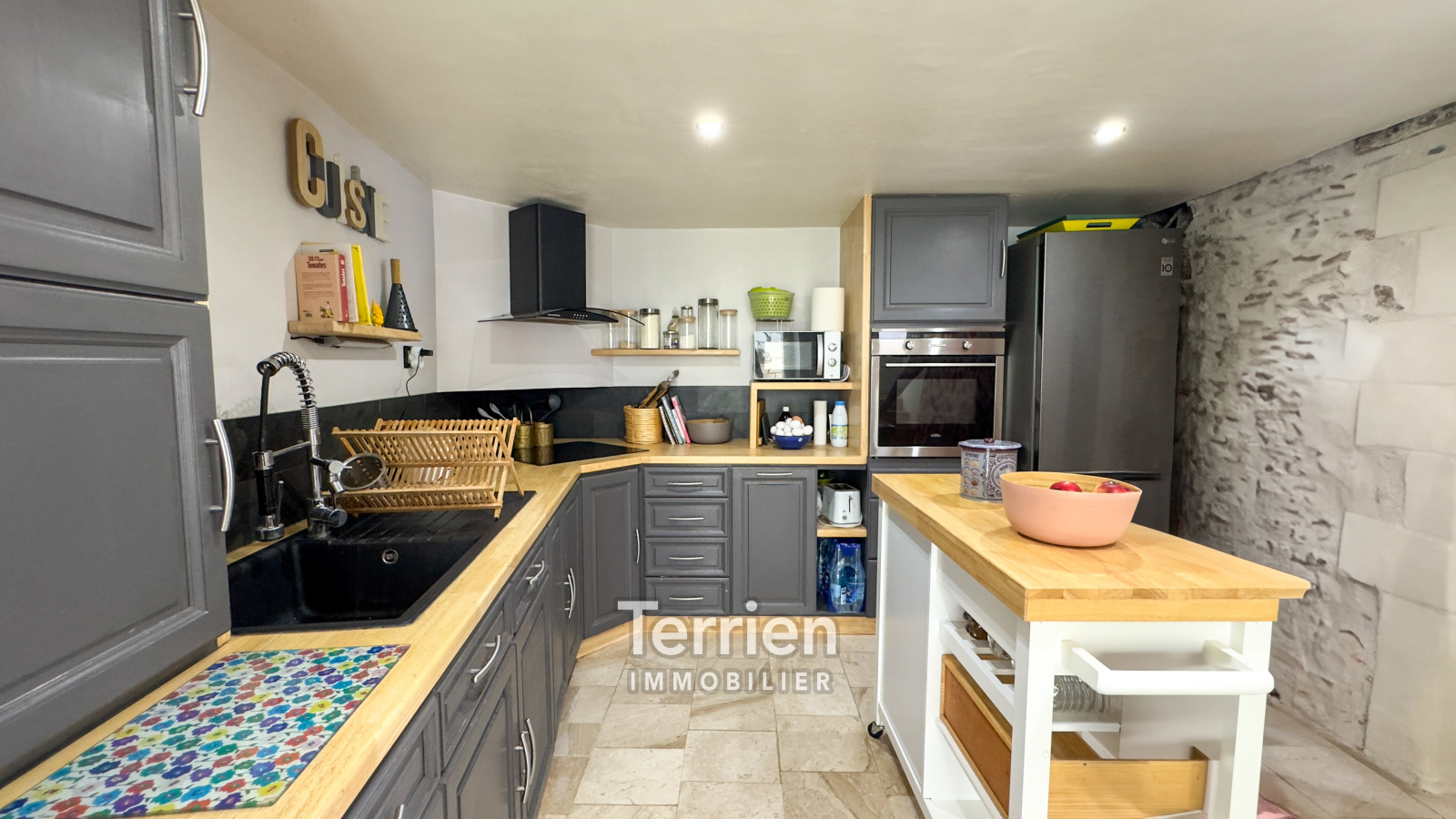 VENDU avec TERRIEN IMMOBILIER. Située au cœur de Montjean-sur-Loire, cette belle maison ancienne entièrement rénovée propose une surface habitable de 103 m². En entrant, vous serez accueilli par un spacieux salon-séjour, doté d'un poêle à bois et un élégant sol en marbre. La cuisine, moderne et fonctionnelle, est équipée d'un îlot central et s'ouvre sur une petite cour intime, idéale pour des repas en toute sérénité. Vous bénéficierez également de deux petites dépendances pour le rangement, d'un accès à la rue, d'un WC séparé sous l'escalier et d'un espace de rangement qui compléte ce niveau. À l'étage, un palier, pouvant faire office de troisième chambre ou bureau, côtoie une belle chambre avec parquet et une salle de bains généreuse, dotée d'une baignoire balnéo. Au dernier étage, une grande chambre avec poutres apparentes ajoutera du caractère à votre quotidien. Parfaitement située à proximité immédiate de tous les commerces, cette maison pleine de charme se distingue par ses matériaux de qualité tels que le marbre et les pierres de tuffeau. DPE E réalisé le 11/03/2025 - Honoraires à la charge de l'acquéreur - TERRIEN IMMOBILIER.