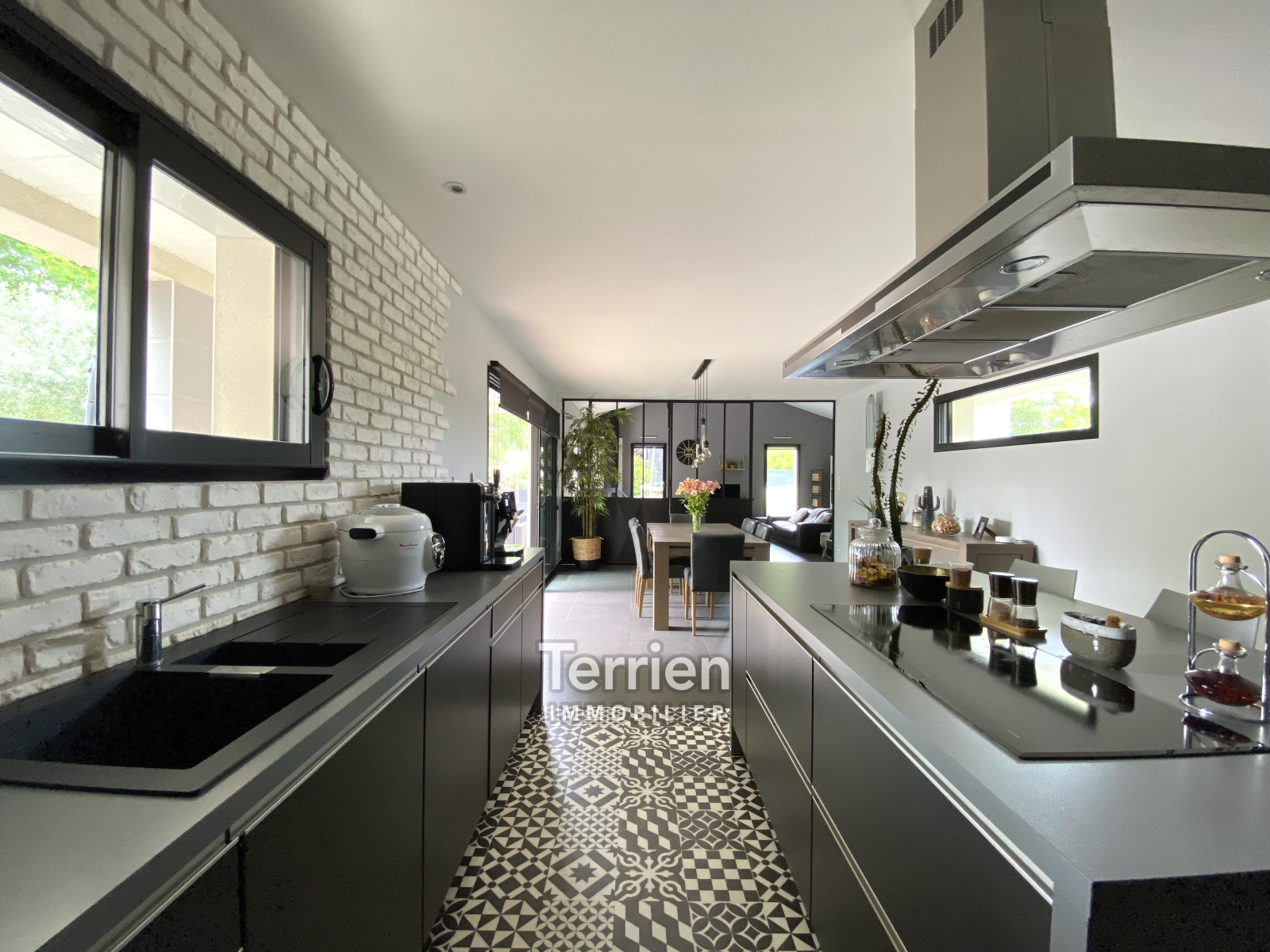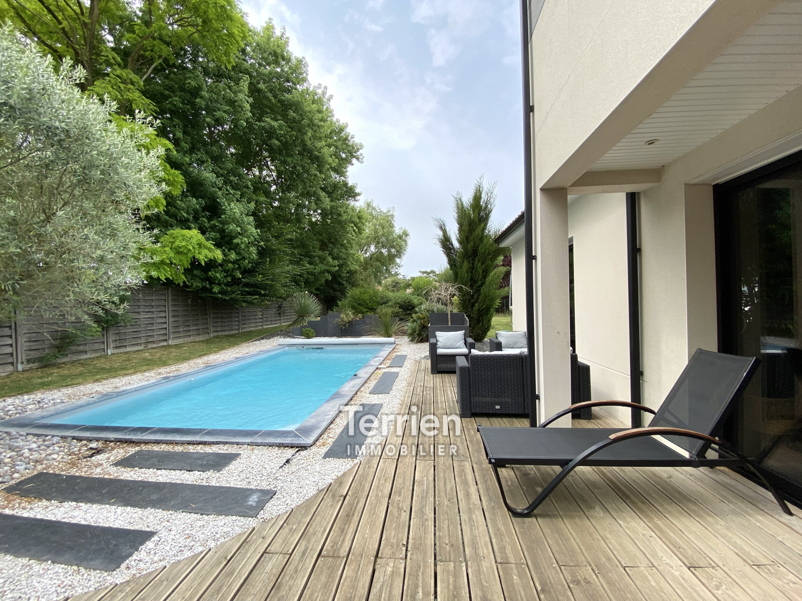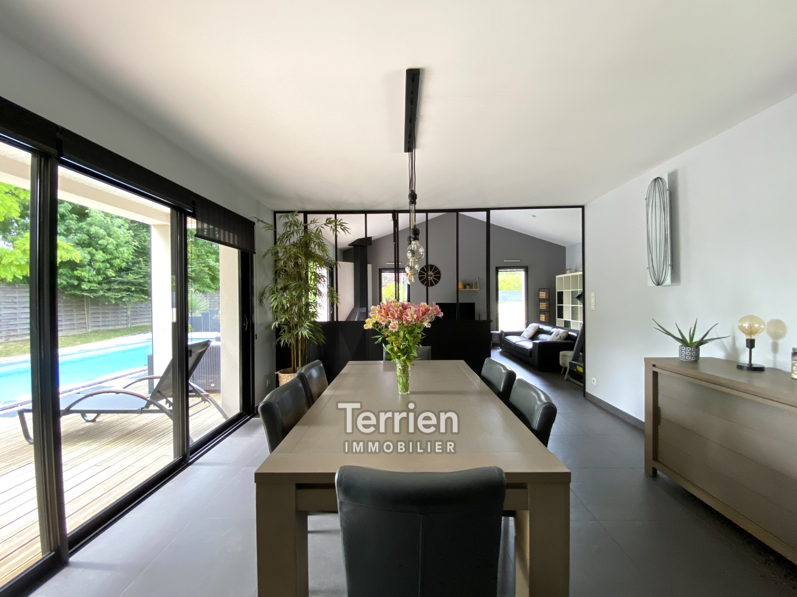 Dans un environnement agréable, une maison de 2010, de construction contemporaine (ARCHIDEA), développant une surface habitable de 156m2 et 186m2 au sol sur 2 niveaux, située sur une parcelle de terrain de 850m2 dans un quartier calme à proximité de Chemillé centre. A l'extérieur, le terrain comporte des aménagements paysagé qualitatif et l'espace terasse est agrémenté d'une piscine de 7m*3,33, chauffée par une PAC. Une entrée dessert la grande pièce de vie comprenant une cuisine dinatoire parfaitement équipée et de belle facture, (four encastré, hotte aspirante, plaques de cuisson, lave-vaisselle et réfrigérateur). Dans la continuité, un séjour lumineux (baie vitrée de 3,30m) avec accès à la terrasse bien exposée. Un coin salon cocooning avec cheminée moderne, pouvant être ouvert et agrandir l’espace grâce à une verrière sur mesure installée. Côté ouest de la maison, on retrouve des rangements intégrés, un wc, une suite parentale avec salle de bains (douche et baignoire). Pour accéder au garage de 28m2, une pièce palière sert de rangements et d’arrière-cuisine. A l’étage le palier/bureau, dessert 3 chambres spacieuses et lumineuses chauffées par des radiateurs électriques, une salle d’eau et un wc complète ce niveau - DPE D - Honoraires à charge vendeur - TERRIEN IMMOBILIER