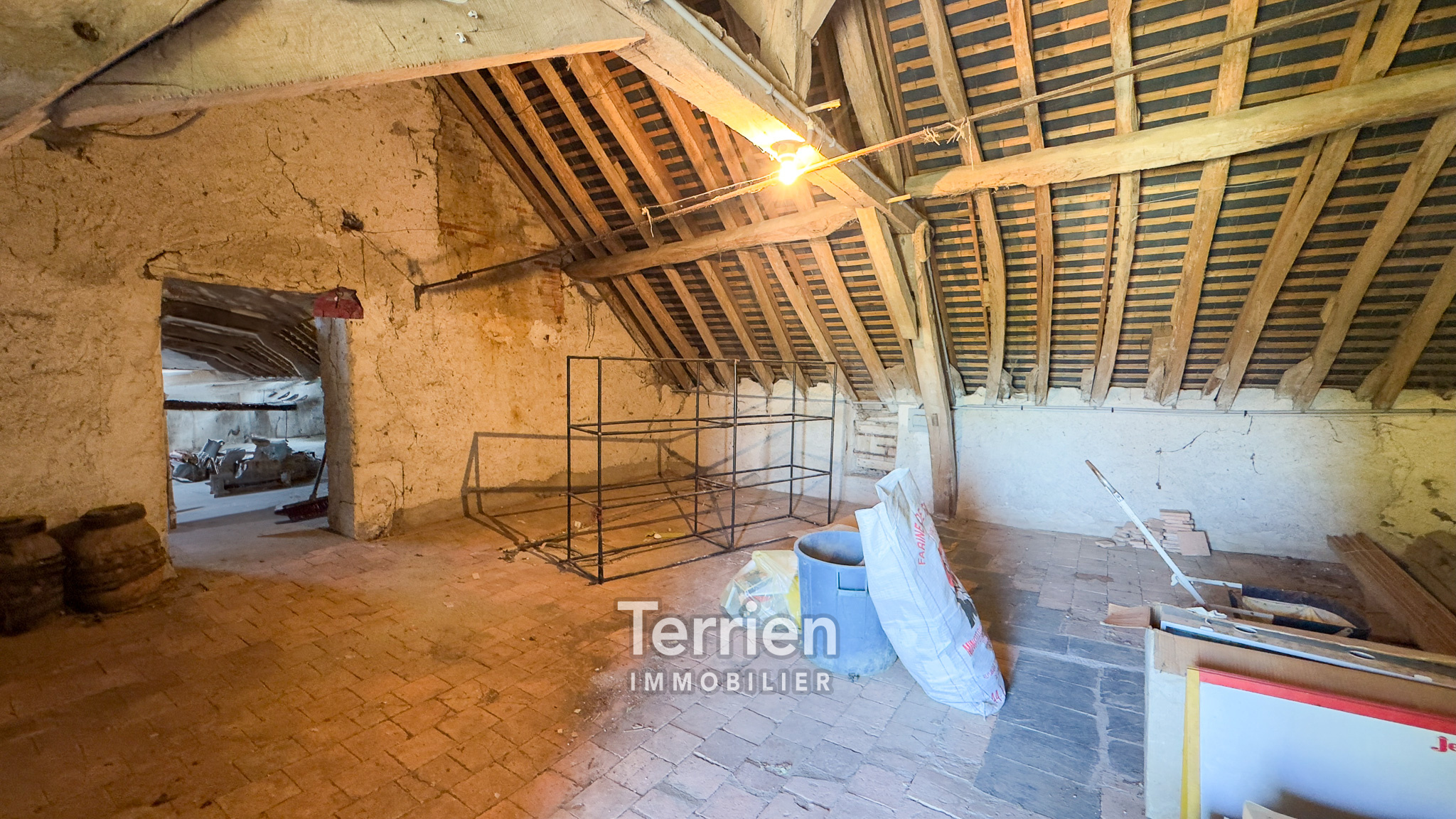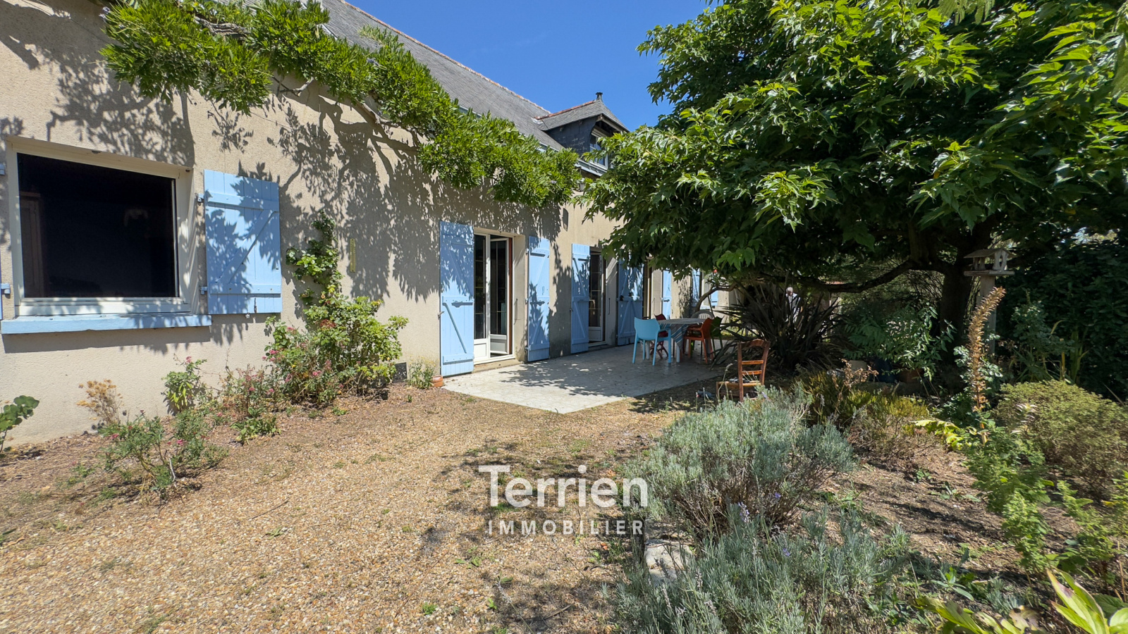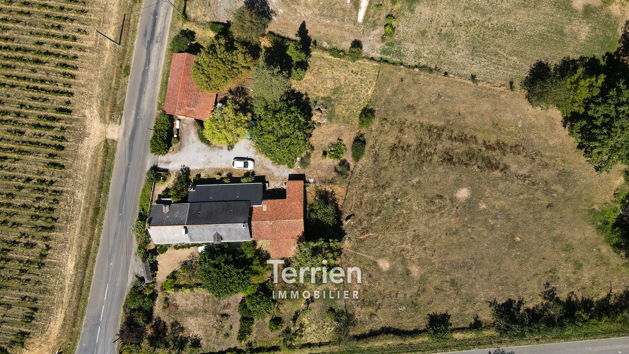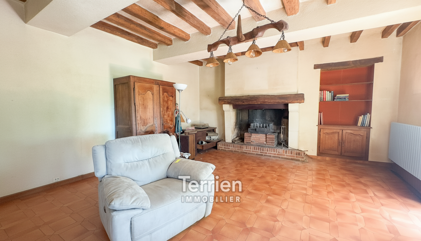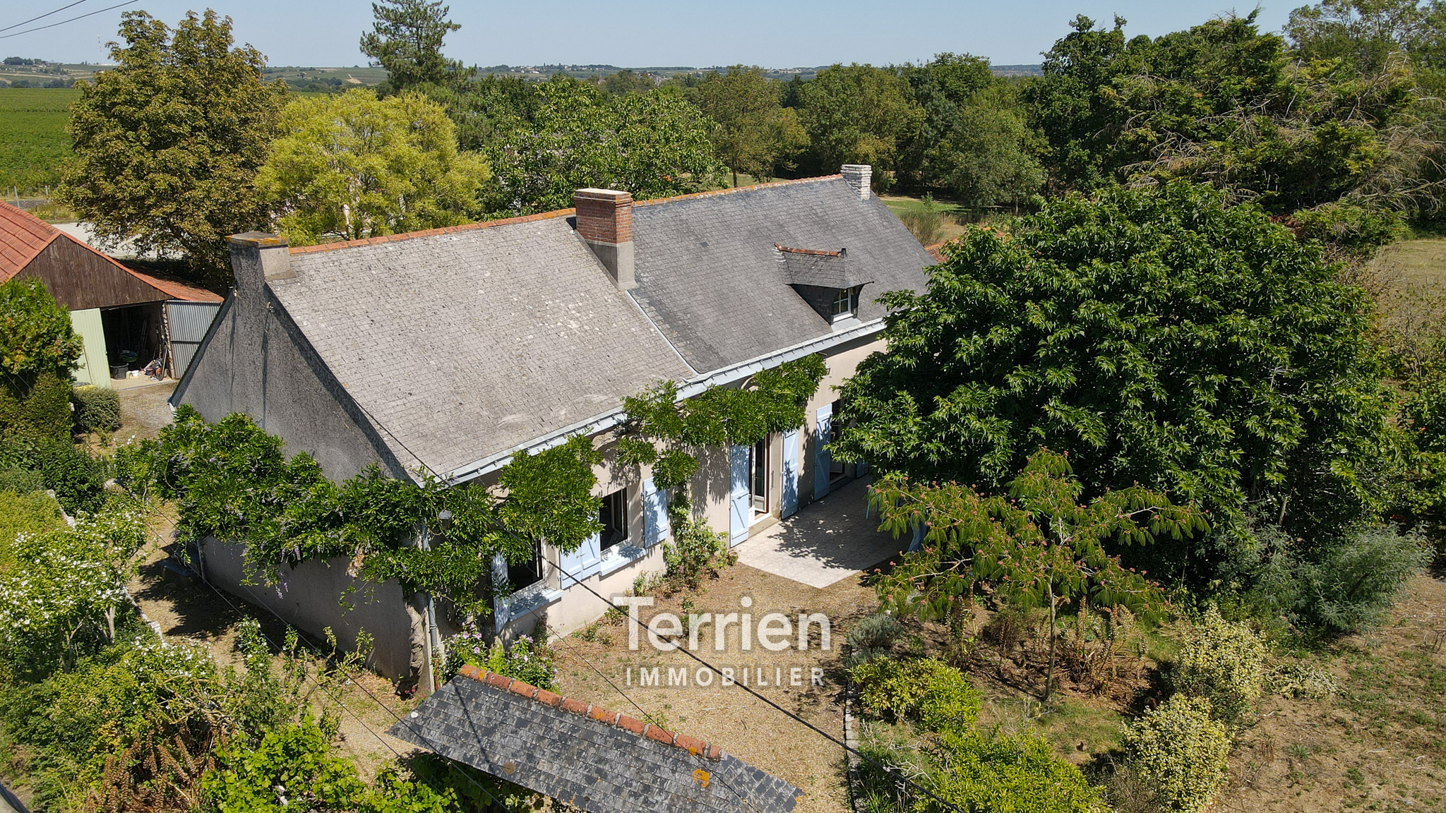 SOUS-COMPROMIS Chez TERRIEN IMMOBILIER - À seulement 4 km du centre de Saint-Aubin-de-Luigné et de Saint-Lambert-du-Lattay, cette maison ancienne, soigneusement entretenue, dégage un charme indéniable et est entourée des magnifiques vignes des coteaux du Layon. Érigée sur un terrain de 9000m2 environ, elle bénéficie d’un aménagement extérieur agréable, comprenant une terrasse orientée Sud-Ouest, un puits utile tant pour le jardin que pour la maison, ainsi qu’un vaste espace de pâture agrémenté d'une mare. L'entrée mène directement à une cuisine ouverte sur un séjour, chacun étant équipé d'une grande cheminée qui apporte chaleur à ces espaces conviviaux. À l'arrière de la cuisine, un couloir conduit à quatre spacieuses chambres, dont deux possèdent un point d’eau. En complément, vous trouverez un débarras, une buanderie avec une chaudière à gaz récente, une salle de douche rénovée et des toilettes séparées. Les pièces de vie, baignées de lumière grâce à leurs nombreuses ouvertures sur le jardin et leur exposition Sud-Ouest, profitent également de menuiseries récentes (alu et bois à l'avant, PVC à l'arrière). L’accès à l’étage s’effectue par un escalier extérieur en pierre et ardoise, menant à un plateau en tomettes à aménager (dalle béton). De belles poutres apparentes ajoutent du caractère à cet espace. Enfin, des dépendances aménageables d’environ 100 m² viennent parfaire ce bien, avec des toitures en bon état et des poutres apparentes.Honoraires à la charge de l'acquéreur - TERRIEN IMMOBILIER