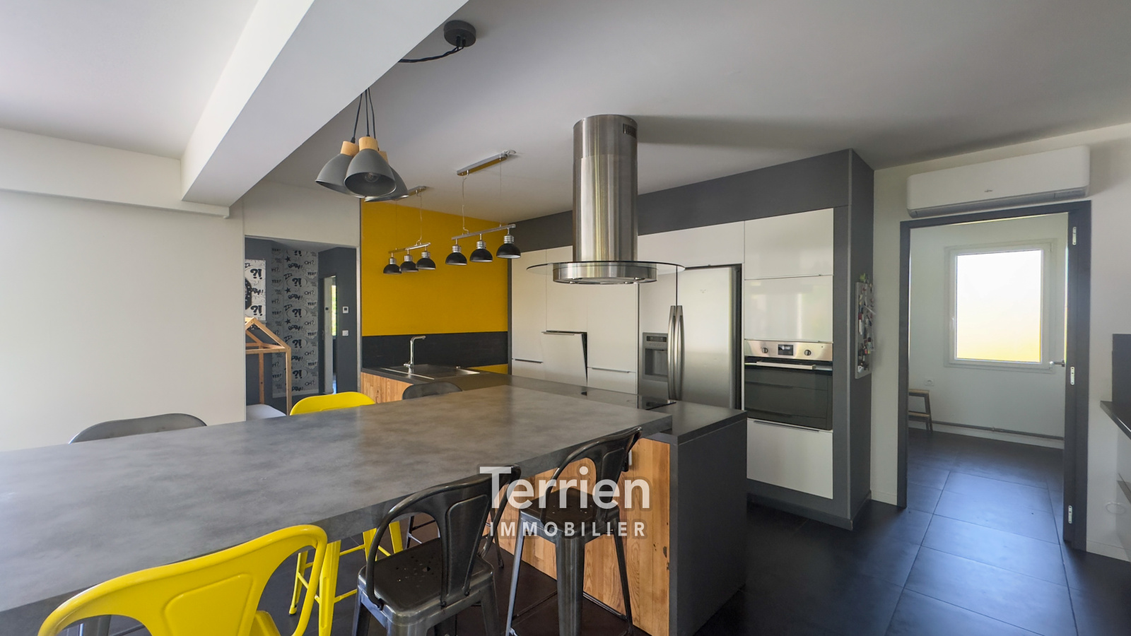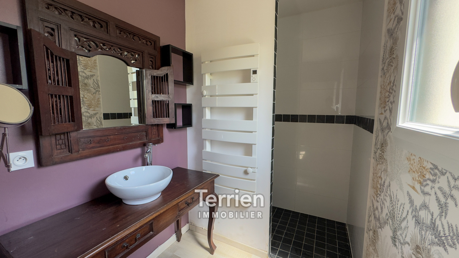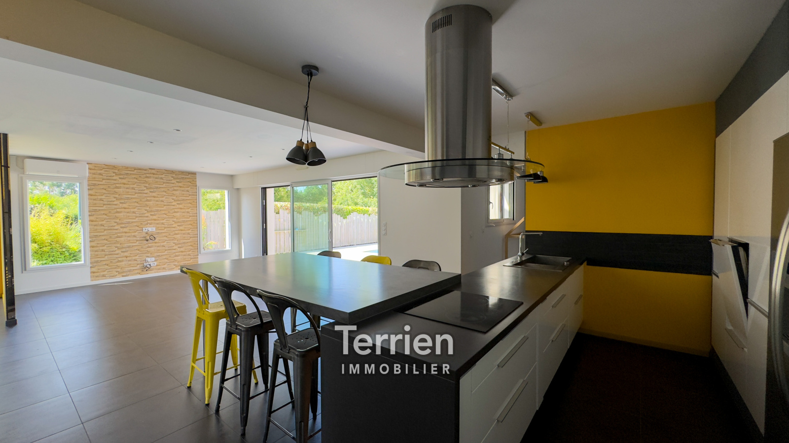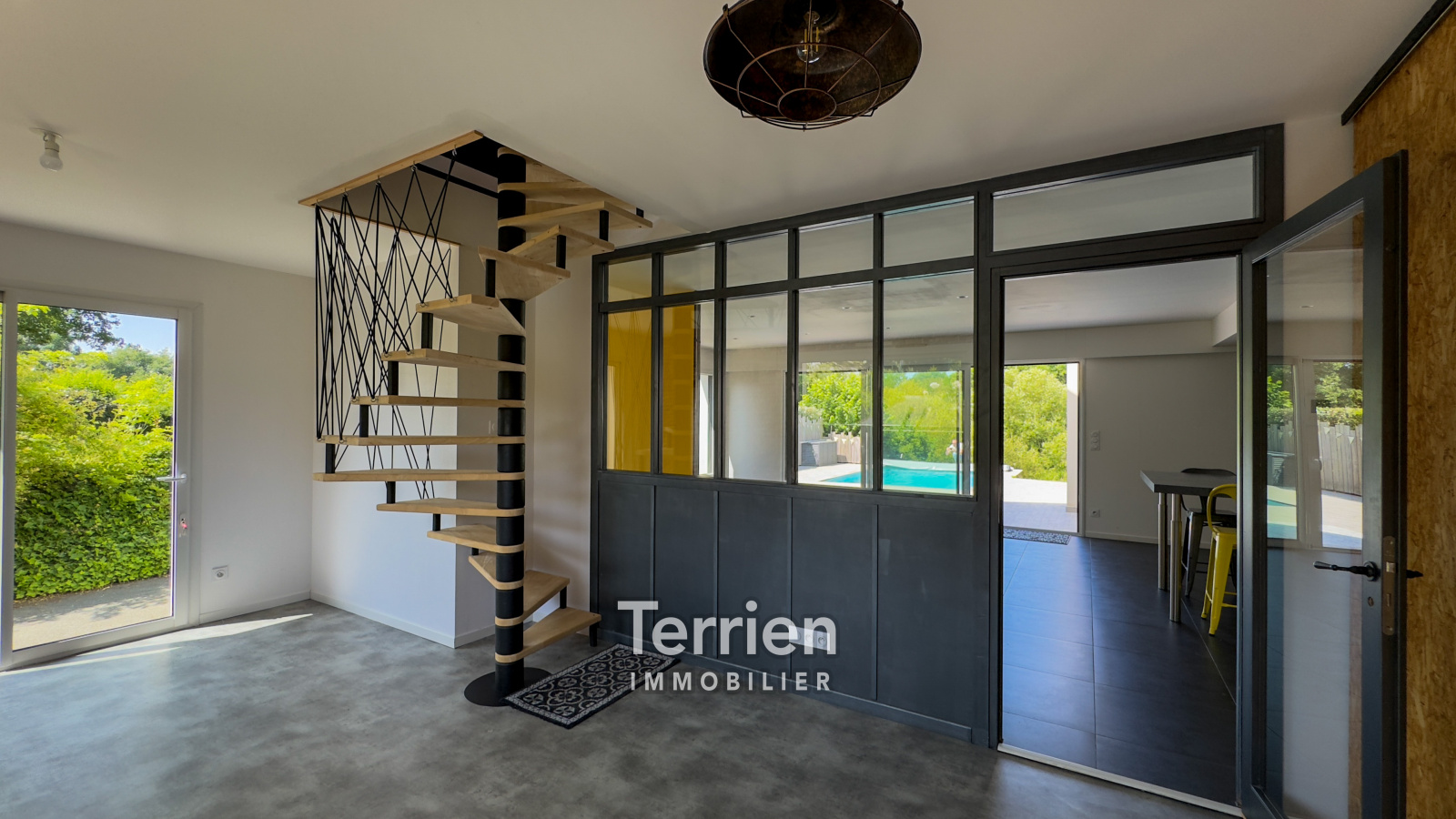 VENDU avec TERRIEN IMMOBILIER. Cette maison exceptionnelle offre un cadre paisible à seulement 10 minutes de Chalonnes sur Loire sur la commune de Sainte-Christine. Construite en 2013, elle présente un design contemporain avec une fusion de styles industriel et moderne. La maison d'une surface habitable de 196 m2 sur un terrain de 982 m2, bénéficie d'une vue dégagée sur la nature sans vis-à-vis. L'entrée conduit directement à une pièce de vie lumineuse de 55 m2, comprenant un salon/séjour avec une cuisine moderne entièrement équipée et conviviale, dotée d'un îlot central. Les larges baies vitrées offrent un accès direct à la terrasse avec une piscine chauffée de 6m * 3,50m grâce à une pompe à chaleur. Adjacente à cette pièce, on trouve un espace actuellement utilisé comme bureau ou salle de sport, avec une décoration charmante imitant des briques, ainsi qu'une arrière-cuisine équipée d'un point d'eau et de rangements. Au rez-de-chaussée, un espace de jeux pour enfants dessert trois belles chambres, une salle de bains équipée (baignoire, double vasque, dressing, placards et sèche-serviettes) ainsi qu'un WC. Pour compléter ce niveau, une suite parentale avec dressing et salle d'eau. À l'étage, une vaste pièce de 37 m2 au sol peut être utilisée comme espace détente ou chambre supplémentaire, offrant de nombreux rangements. À l'extérieur, un cabanon en bois sert de lieu de stockage pour l'entretien ou peut être utilisé comme local à vélos. L'entrée bitumée permet le stationnement de plusieurs véhicules. La maison est équipée de tout le confort moderne, notamment le chauffage au sol, la climatisation réversible dans les pièces principales, des volets roulants électriques et des baies vitrées à double vitrage. Les honoraires sont à la charge du vendeur. TERRIEN IMMOBILIER