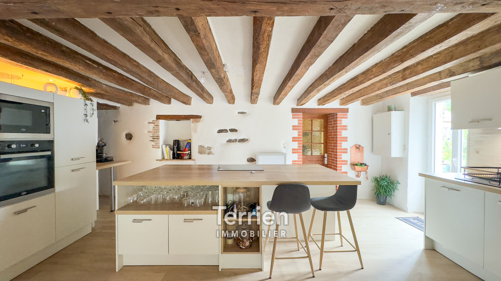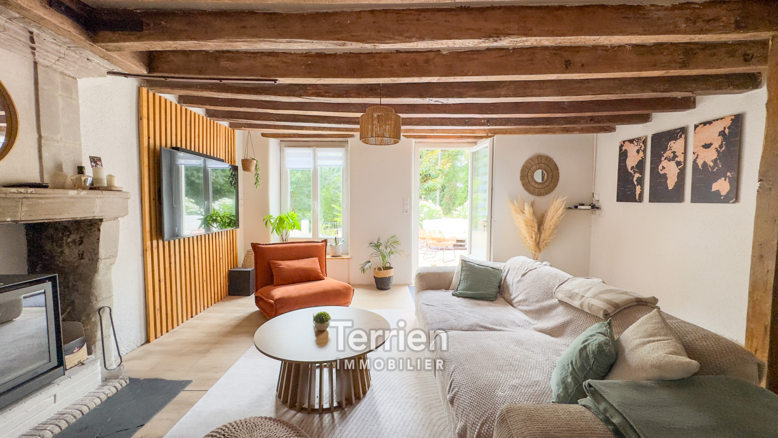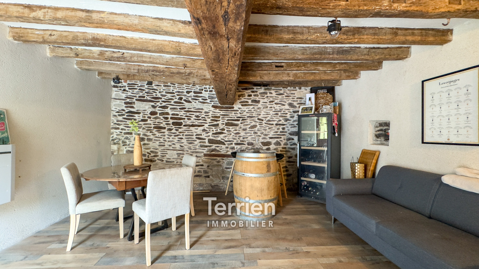 EN EXCLUSIVITÉ chez TERRIEN IMMOBILIER. Venez découvrir cette ravissante demeure ancienne nichée sur l'île de Chalonnes-sur-Loire, à seulement 2,5 km du cœur du bourg de Chalonnes-sur-Loire. Cette maison pleine de charme repose sur un grand terrain de 1350 m², avec une belle terrasse à l'avant et un espace détente à l'arrière. À l'intérieur, vous serez séduit par un vaste salon chaleureux muni d'un poêle à bois inséré dans une cheminée en tuffeau, donnant sur une cuisine moderne entièrement aménagée. Les amateurs d'authenticité apprécieront les poutres apparentes qui ornent le lieu. Le rez-de-chaussée comprend également une salle de bains, des toilettes, une buanderie, ainsi qu'une grande pièce avec mur en pierre qui peut servir de chambre. À l'étage, un palier mène à quatre chambres bénéficiant d'une belle hauteur sous plafond, dont une suite parentale avec salle d'eau privative récemment refaite. Vous y trouverez aussi un WC. Cette propriété est idéale pour les passionnés de la Loire, offrant un cadre parfait pour les balades à vélo, tout en étant proche des commerces et du centre-bourg. Les frais d'agence sont à la charge des acquéreurs. Terrien Immobilier.