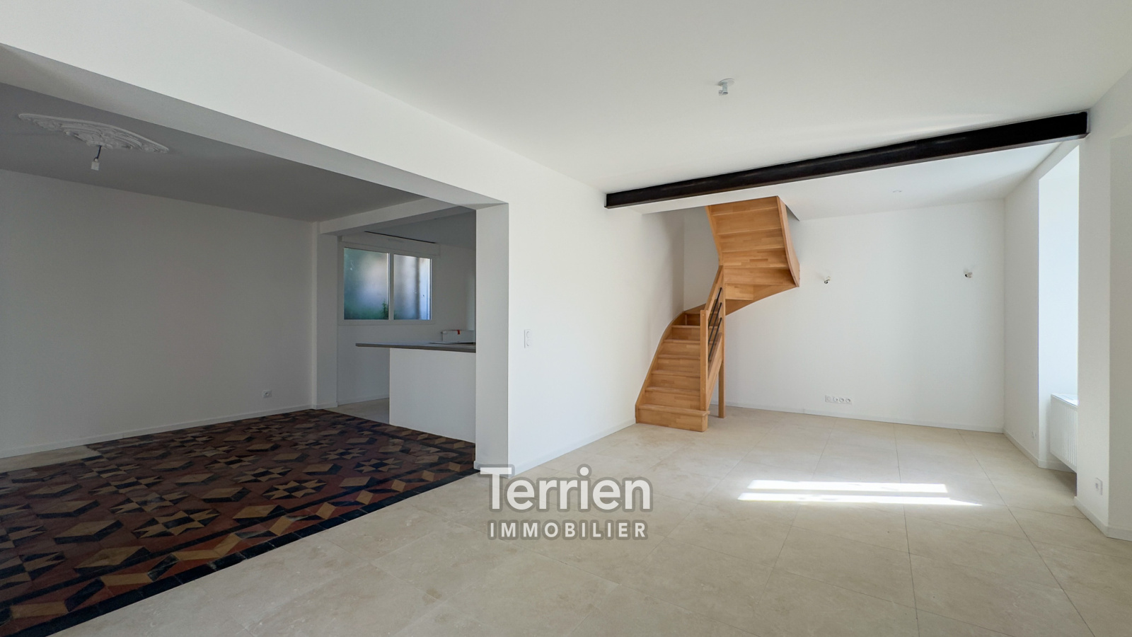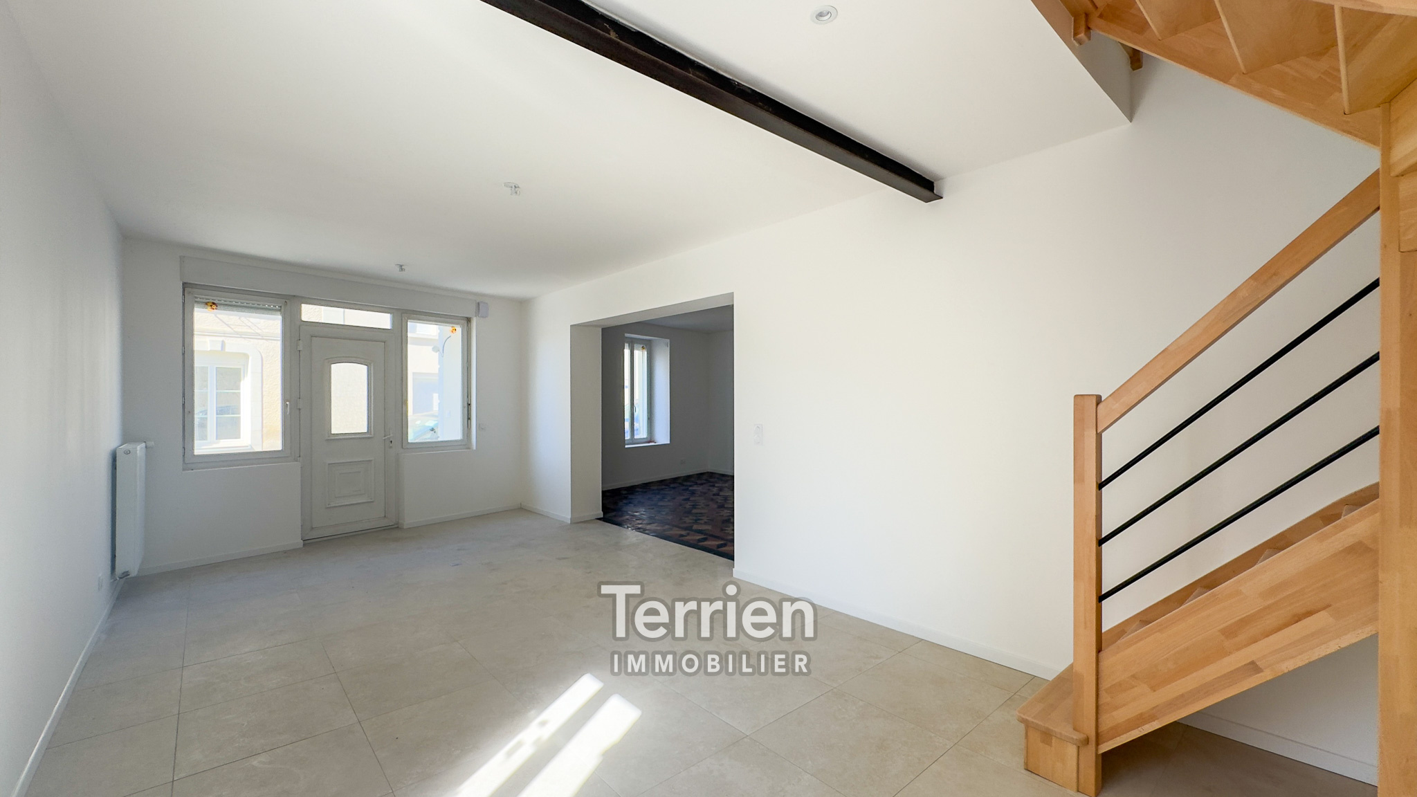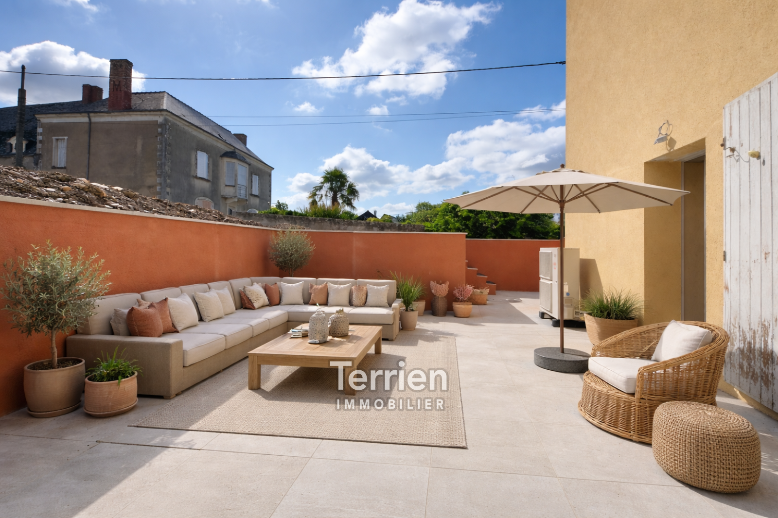 EN EXCLUSIVITE chez TERRIEN IMMOBILIER. Nichée dans un charmant village au cœur des vignes situé à 10 minutes de Chalonnes et à 20 km d’Angers, cette maison de bourg entièrement repensée est idéale pour accueillir une famille. Dès le rez-de-chaussée, vous serez séduit par une belle pièce de vie ouverte, comprenant un salon, une salle à manger ornée d’authentiques carreaux de ciment, ainsi qu’une cuisine équipée d’un plan de travail en inox. Dans la continuité, vous trouverez un espace chaufferie, un WC, une lingerie, ainsi qu’un bureau lumineux ouvert sur l’extérieur grâce à une verrière type atelier. À l’étage, le palier dessert un WC, une salle d’eau, deux grandes chambres avec cheminées anciennes, ainsi qu’une chambre d’enfant. Dans le prolongement, une suite parentale se dévoile, composée d’un dressing, d’une salle d’eau privative et d’une chambre. Une échelle escamotable permet d’accéder au grenier, offrant un potentiel d’aménagement supplémentaire d’environ 70 m². À l’extérieur, une vaste cour / terrasse de 80m² invite à profiter de repas ensoleillés. Vous bénéficierez également de deux espaces de stockage, d’une cave avec puits, ainsi que 2 places de stationnement privatives. Possibilité d'acquérir en sus 300 m² de terrain supplémentaire. La maison a fait l’objet d’une rénovation soignée, avec une optimisation des espaces, des huisseries en double vitrage avec volets motorisés, une isolation refaite, et un système de chauffage performant par pompe à chaleur. DPE B. Honoraires à charge acquéreurs. TERRIEN IMMOBILIER Les informations sur les risques auxquels ce bien est exposé sont disponibles sur le site www.georisques.gouv.fr. Pour plus d'informations ou pour organiser une visite, contactez Aymeric Viot : 06 03 77 04 02. Agent commercial - EI VIOT AYMERIC - immatriculé au R.S.A.C. d'Angers sous le numéro 977866425.