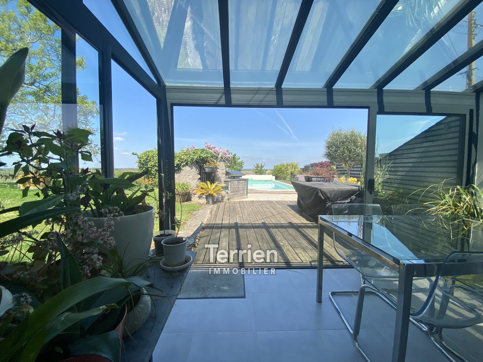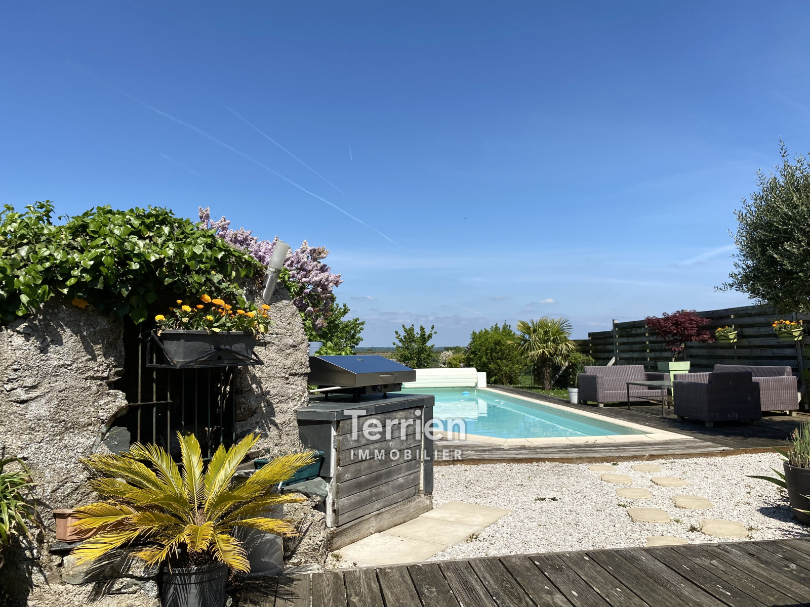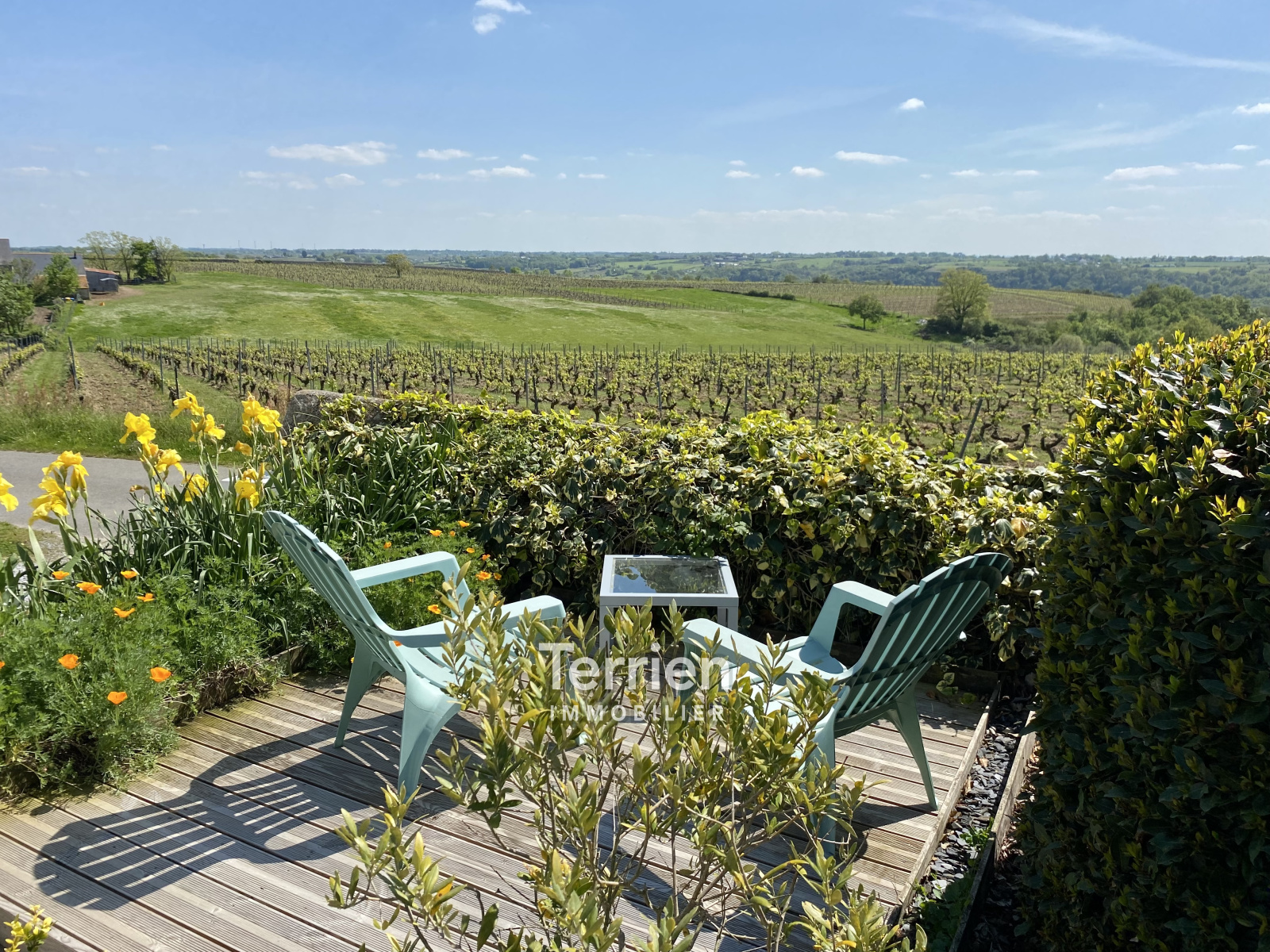 Une maison datant du 19ème siècle profitant d'un cadre exceptionnel, vue 360 degrés sur les vignes, les coteaux et les moulins à vents d'Ardenay sur un terrain arboré d'une surface de 2.700m2. Accès à la gare de Chalonnes en 7min et commerces en 10min. L'accès de la maison côté sud se fait via une entrée avec glycine, un salon/séjour spacieux équipé d’un poêle à bois, une salle d'eau et un WC, une cuisine toute équipée (plaques, four et lave-vaisselle). La cuisine et le salon ont du cachet avec les poutres apparentes, une arrière-cuisine, un atelier avec branchement pour la machine à laver et un point d'eau. Deux chambres dont une avec dressing sur mesure, lit double et mobilier de rangements avec un sol en tomettes, la seconde chambre dispose d'une douche et d'un accès direct à la véranda. A l'étage un espace mezzanine pouvant servir d’espace détente ou bureau pour le télétravail, une grande chambre, une salle de bain avec baignoire, lavabo et WC. A l'extérieur une piscine de 4m X 8m chauffée par une pompe à chaleur, une véranda de 9m² avec vue sur la piscine, un garage, un abris bois et une terrasse exposée plein Sud avec vue sur la vallée. Honoraires à charge vendeur - Bien très rare sur le secteur - TERRIEN Immobilier