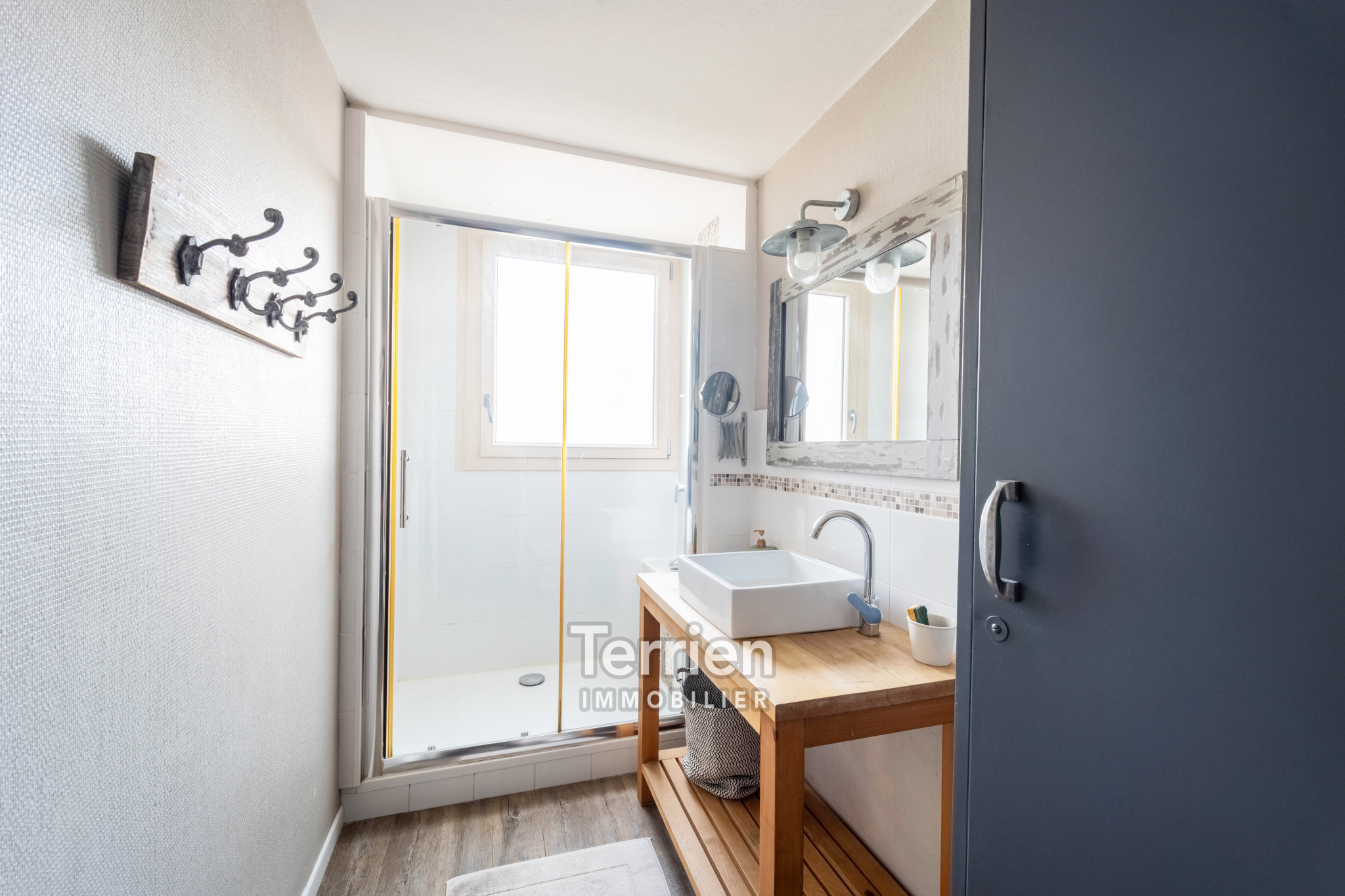 Un couloir avec grand placard / dressing facilite le rangement et dessert une salle d’eau moderne comprenant douche, vasque et WC.