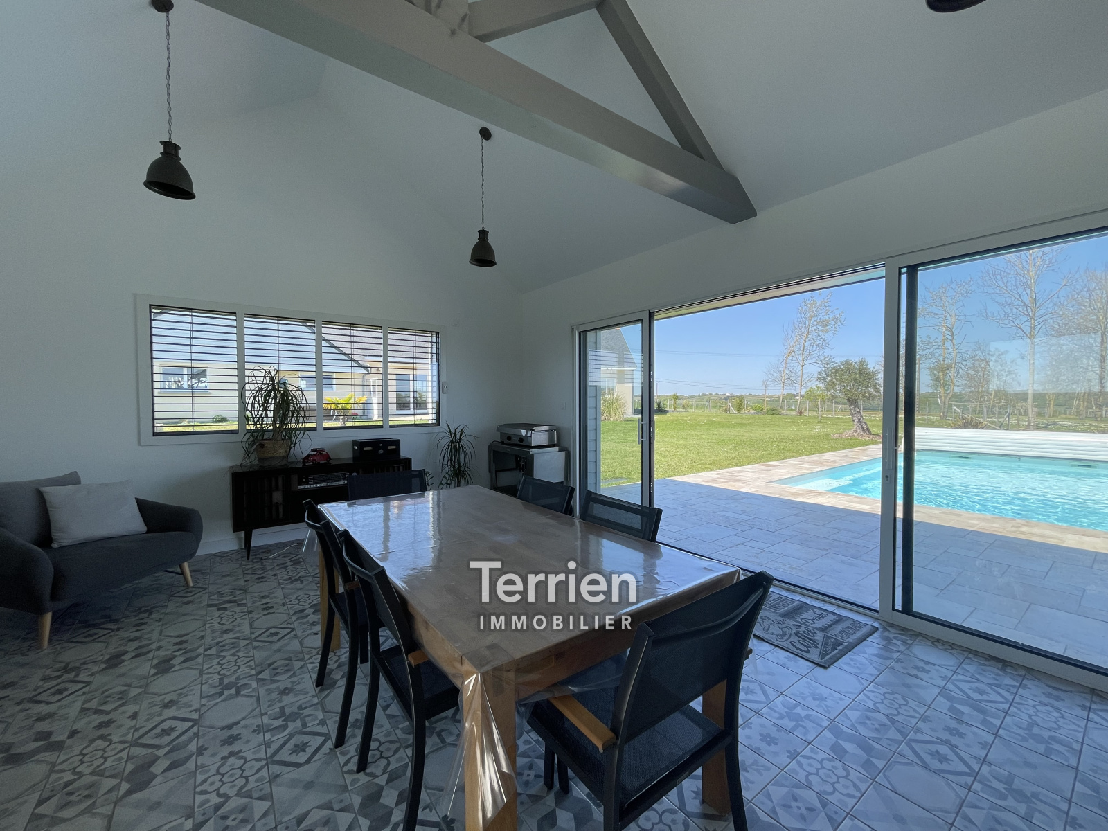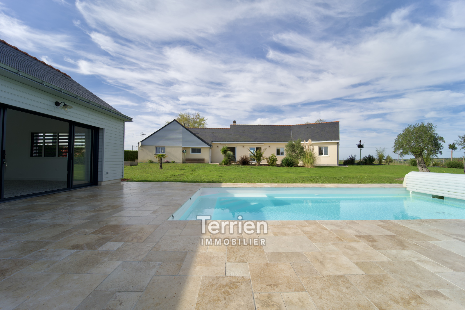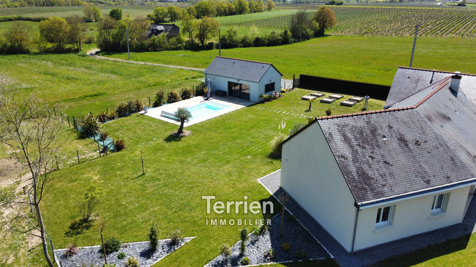 Une belle maison familiale tout confort orientée plein sud et vers sa piscine, située dans un cadre très agréable avec vue sur les vignes et la nature, sur une grande parcelle de 17810m2. La maison développe 177m² habitable de plain pied comprenant une pièce de vie 50m2 avec salon/séjour et une cuisine équipée et son accès direct sur la terrasse. Toujours de plein-pied, on retrouve une suite parentale avec salle d'eau moderne, ainsi que quatre autres chambres avec une salle d'eau commune. Côté extérieur une piscine de 8x4 mètres chauffée par une PAC, un pool house aménagé avec une cuisine d'été très agréable orientée vers la piscine, le local technique et un WC. La maison dispose d'un système de chauffage au sol par géothermie, ainsi qu'un poele à bois très efficient. Le bien bénéficie également d'un grand garage avec portail motorisé pouvant acceuillir 2 véhicules, un grenier, et une cave en sous-sol. DPE B - Honoraires à charge acquéreur- TERRIEN IMMOBILIER